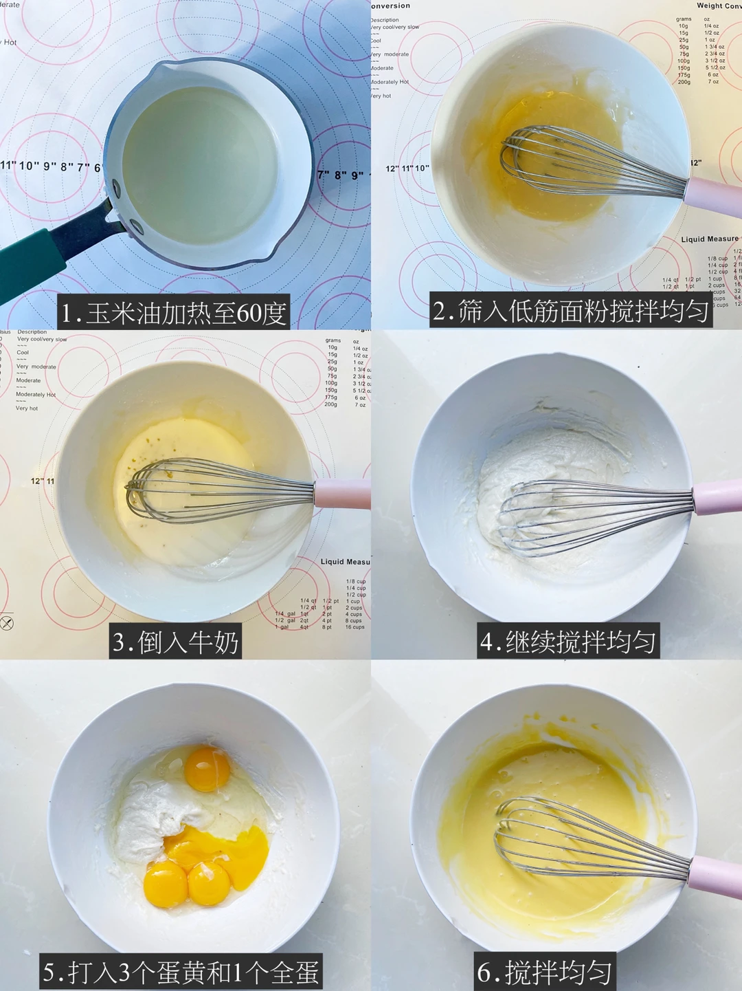 ③这次做的蛋糕胚用的是日式戚风的方法,玉米油需要加热,所以蛋糕胚格外松软细腻
