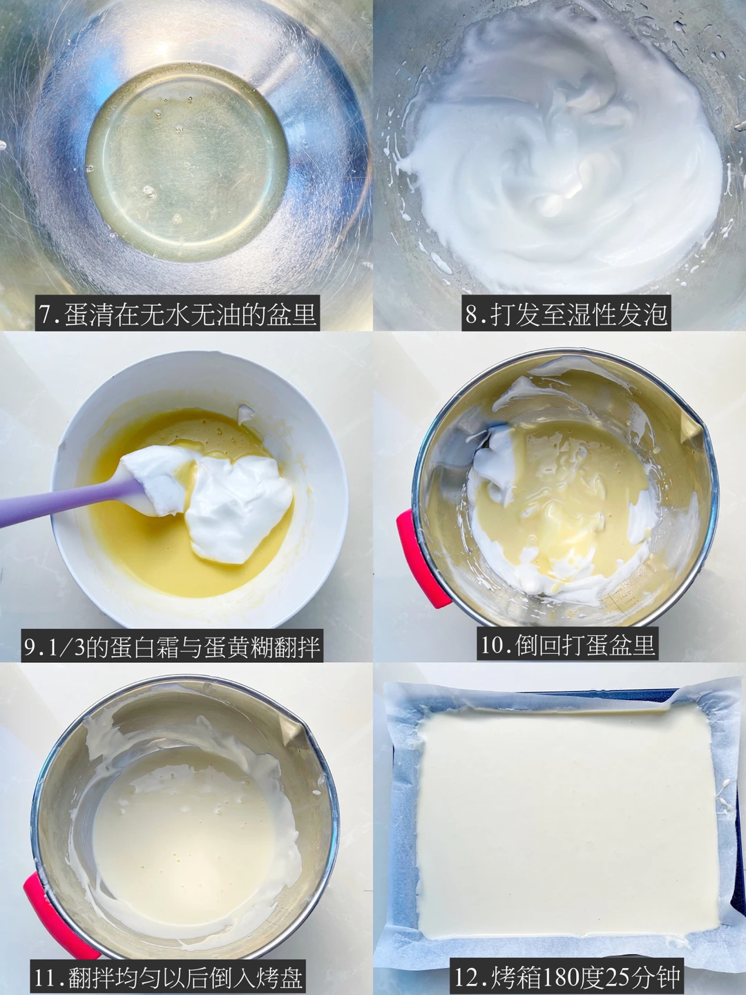 4️⃣先取1/3的蛋白霜与蛋黄糊翻拌均匀,再倒回蛋白霜里翻拌均匀以后倒入烤盘里。入烤箱180度25分钟🕰