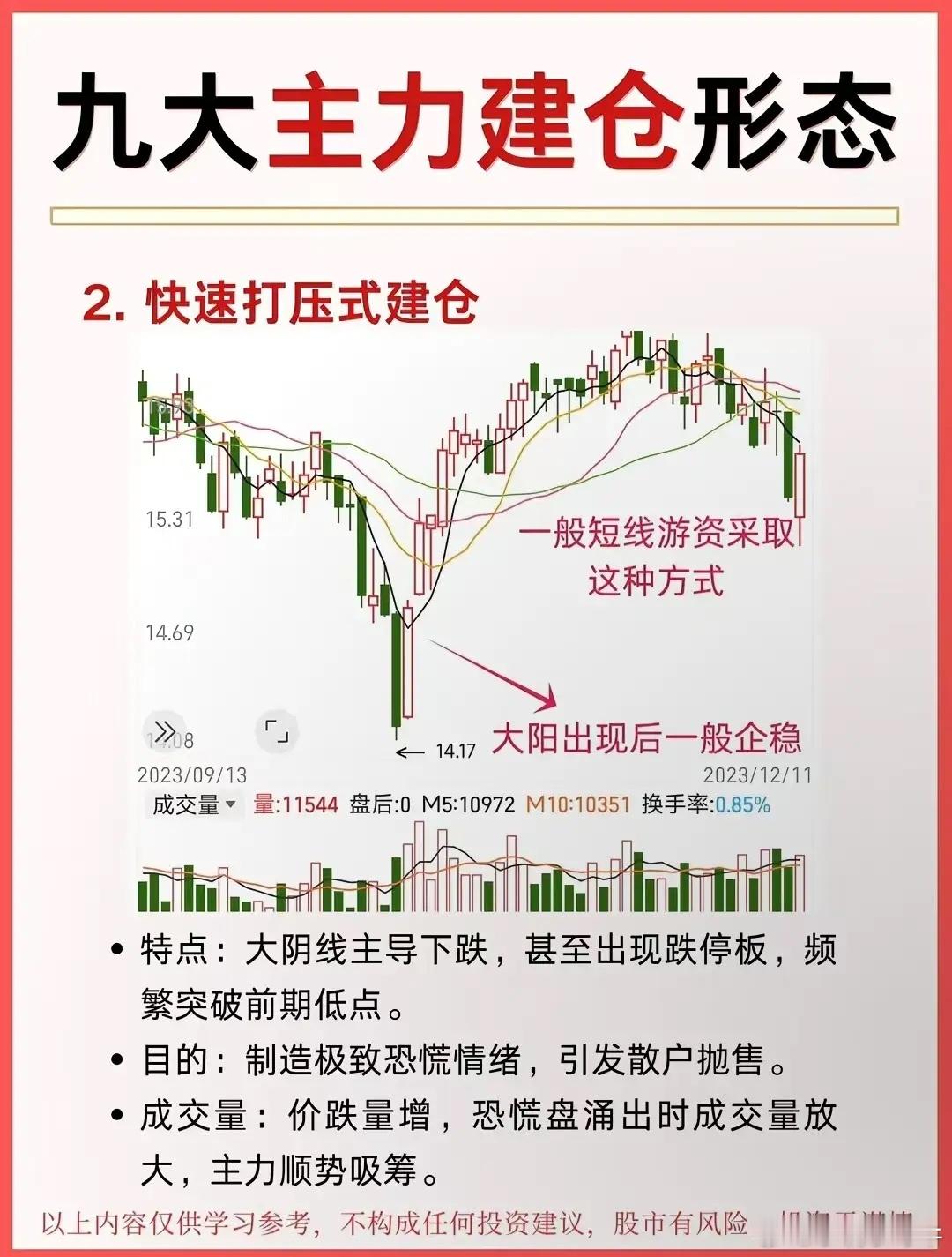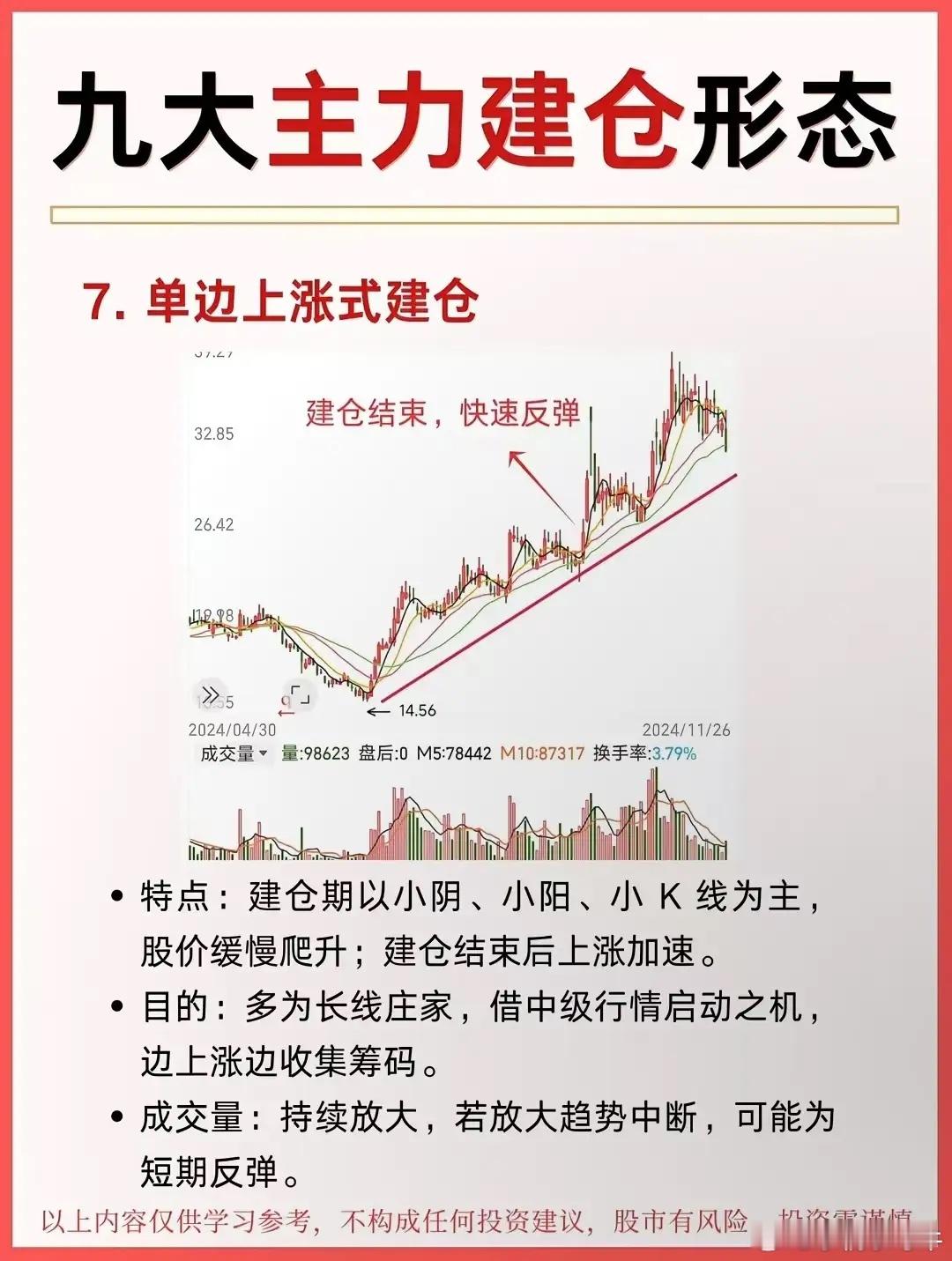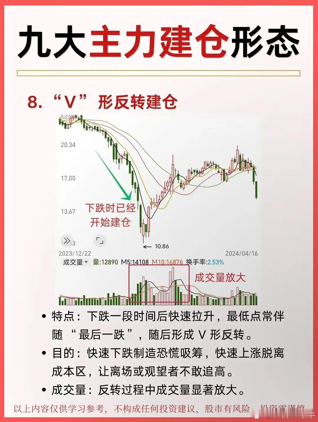 九大主力建仓形态!单边上涨:慢涨温和放量 ;V形反转:急跌急涨放量箱体震荡箱内反复,破上沿启动快速上涨:缓慢打压:缩量阴跌破趋势线拉升快速打压:大阴砸盘,恐慌后启动长期震荡:横盘数月破平台启动。主力建仓的“闪电战”:V形反转建仓!股价先一路下探,在“最后一跌”里,主力已经悄悄开始吸筹;随后直接旱地拔葱式拉升,走出V字曲线。这波操作的核心是“快”——快速下跌砸出恐慌盘,快速上涨脱离成本区,让想抄底的散户根本追不上。