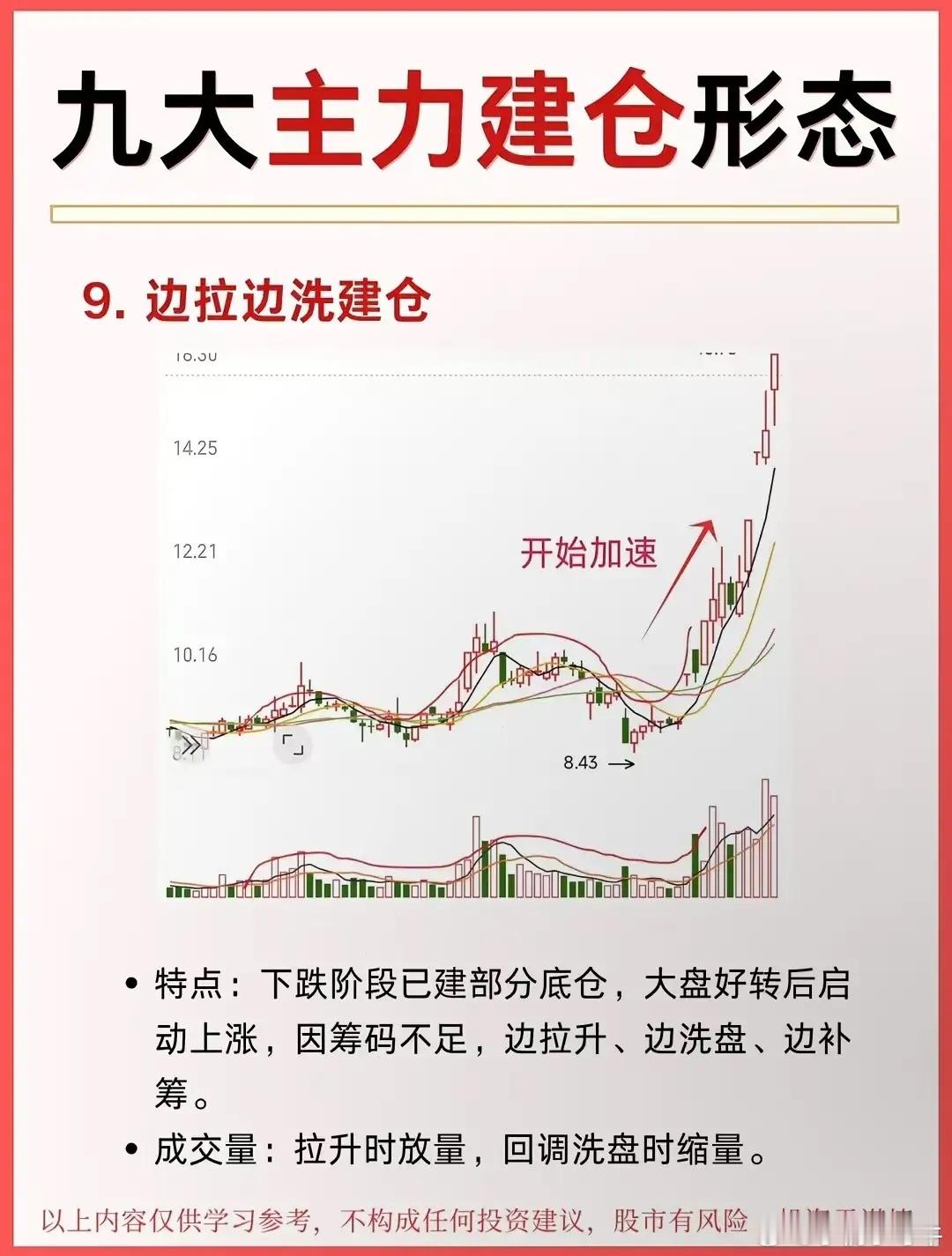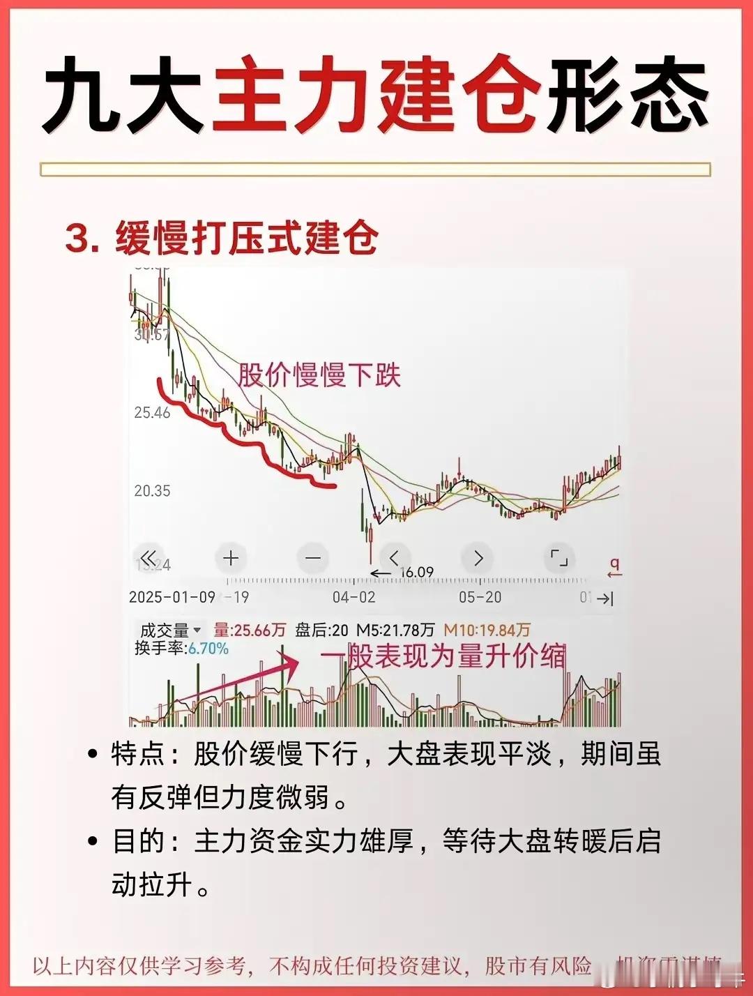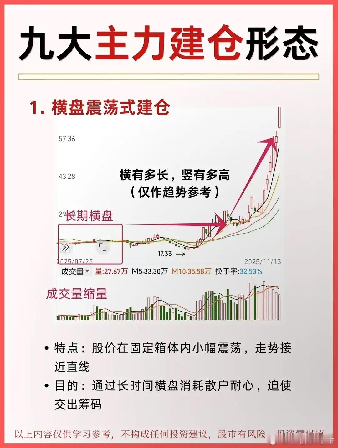 九大主力建仓形态!单边上涨:慢涨温和放量 ;V形反转:急跌急涨放量箱体震荡箱内反复,破上沿启动快速上涨:缓慢打压:缩量阴跌破趋势线拉升快速打压:大阴砸盘,恐慌后启动长期震荡:横盘数月破平台启动。主力建仓的“闪电战”:V形反转建仓!股价先一路下探,在“最后一跌”里,主力已经悄悄开始吸筹;随后直接旱地拔葱式拉升,走出V字曲线。这波操作的核心是“快”——快速下跌砸出恐慌盘,快速上涨脱离成本区,让想抄底的散户根本追不上。