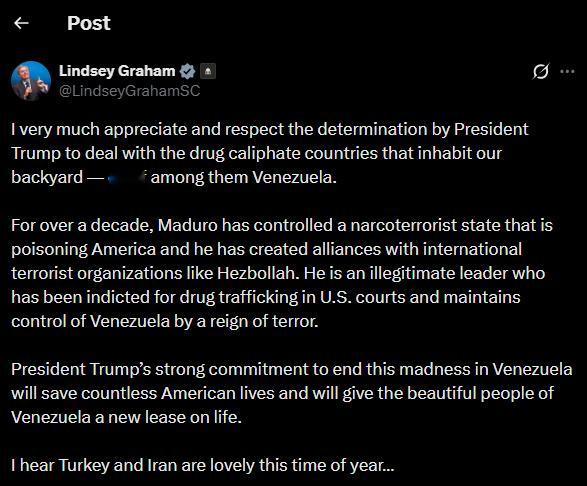 😴 林赛·格雷厄姆继续在社交平台威胁马杜罗下台这么长时间以来你做成什么了吗?无论是俄乌还是加勒比海,你看有人会搭理你吗?玻利瓦尔英雄之地委内瑞拉烽火问鼎计划