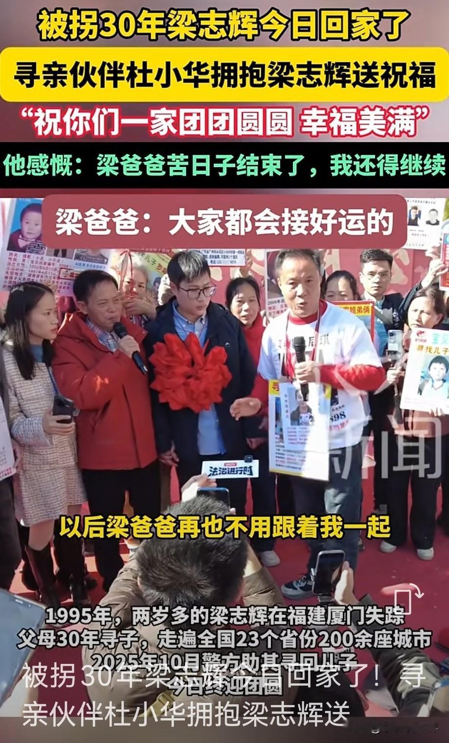 “让你们也受委屈了!为了找志辉,没有享受过爸爸妈妈的爱,希望你们原谅爸爸妈妈!”认亲现场,梁爸爸愧疚地哭着对其他孩子说。 看着这一幕,真是又心酸又为他们高兴,被拐32年的梁志辉终于回家了! 梁志辉说十年前去厦门,经过红绿灯时,看到过梁爸爸在找孩子,但不知是找的自己。 整整三十二年呐!梁爸爸梁妈妈为了找志辉,吃尽了千辛万苦。梁妈妈在家里拼命打工挣钱,梁爸爸天南海北满处找志辉。 他说,在他手里丢的志辉,只是在厨房炒菜的几分钟时间,志辉就不见了,他必须拼尽性命也要把志辉找回来,否则对不起梁妈妈还有志辉的爷爷奶奶。 32年,23个城市,200多座城市,梁爸爸的辛苦终于有了回报,志辉找到啦!但认亲现场,还有很多家长还在寻亲路上。 愿天下无拐,更希望领养的家庭让孩子去宝贝网站等机构登记,让他们和亲生父母早日团聚。