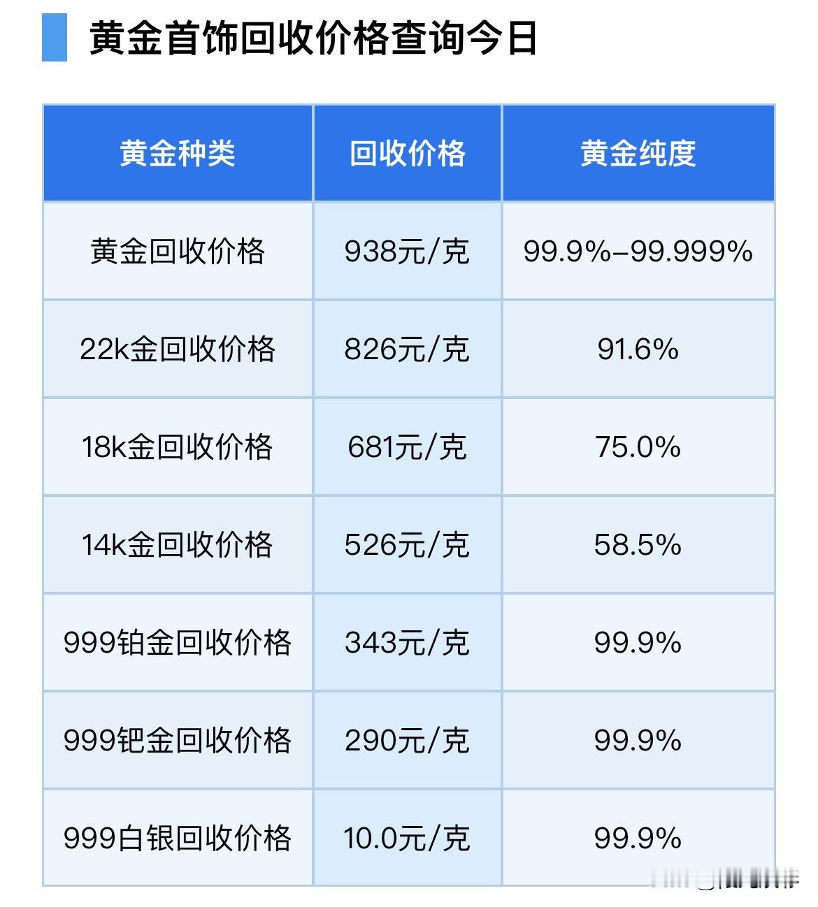 炒金的快看 最新消息 最新黄金回收价格查询 今日黄金回收行情, 现在黄金回收价格938元/克, 22k黄金回收价格826元/克, au900黄金回收价格826元/克, 18k黄金回收价格681 元/克, 14k金回收价格526元。 回收黄金注意事项: 1,了解黄金的重量, 2,了解黄金的成色, 3,了解当日的黄金行情。 所有信息,都只是提供参考! 炒金有风险,购买需谨慎!