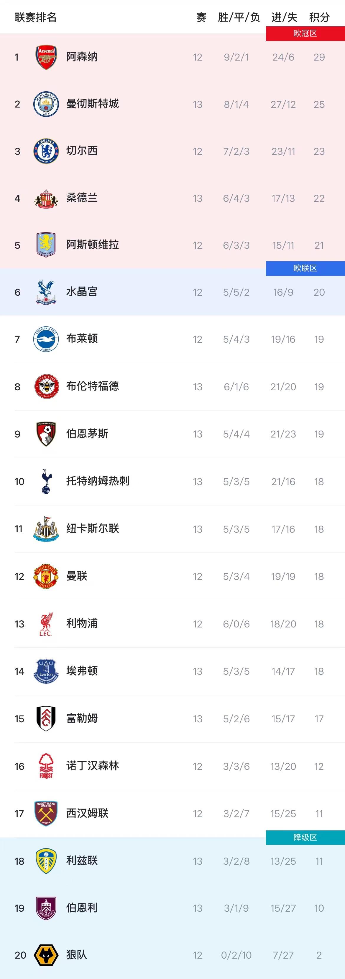 中游和保级区的排位也有不小波动。布伦特福德本轮比赛末段连进三球,3比1战胜伯恩利,积分涨到19分,已从第13攀升至第8,把对手死死压在降级区。纽卡则在客场4比1大胜埃弗顿,喜鹊积分追平热刺、曼联、利物浦、埃弗顿。