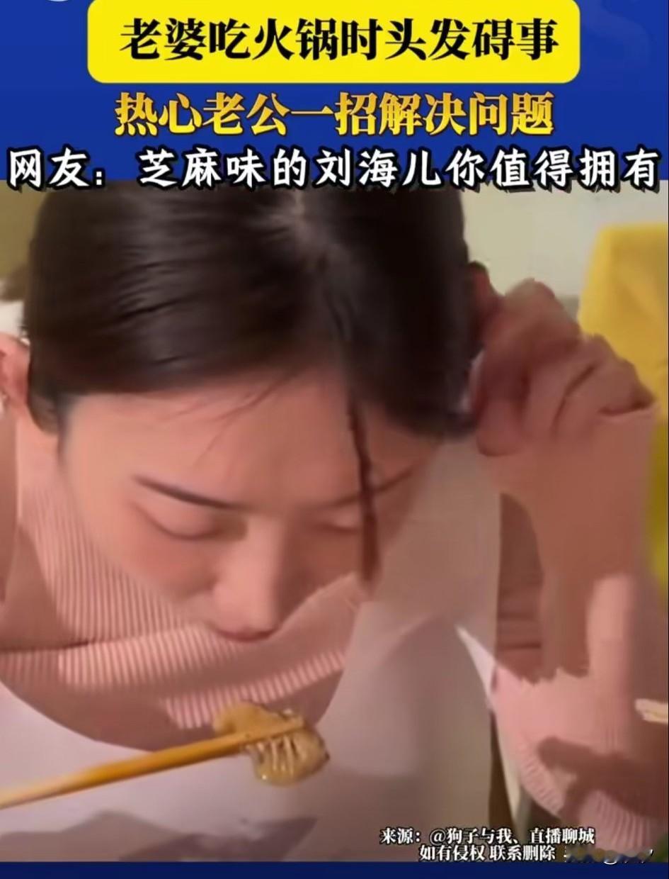近日老婆吃火锅到时候, 不停的用手扶着刘海, 非常的不方便, 这让旁边的老公看到