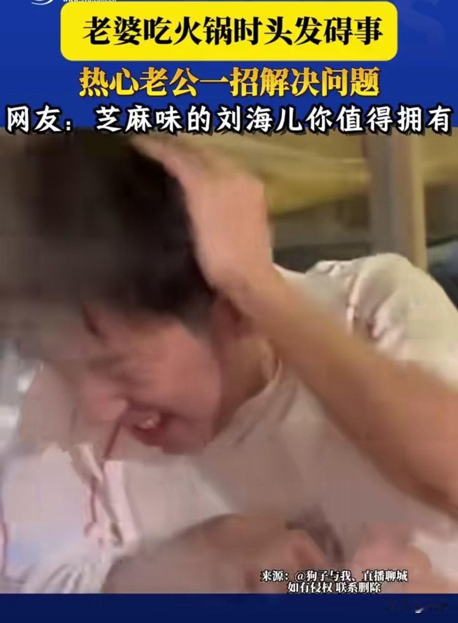 近日老婆吃火锅到时候, 不停的用手扶着刘海, 非常的不方便, 这让旁边的老公看到了, 看着她一会扶左边的刘海, 一会要又扶右边的刘海, 热心的老公直接抱着老婆, 用口水舔了老婆的刘海, 弄湿后用手将刘海粘在头上, 这让妻子震惊不已, 有点儿嫌弃自己的老公, 但是又觉得非常的好笑, 在老公做完这一切之后, 就直接用小拳头对着老公招呼, 老公也是急忙躲闪, 一看两人就是平时爱玩, 真是相爱的人成为夫妻趣事多, 可以看出两人就是生理性喜欢, 这样的婚姻才有意义, 大家对于夫妻之间的趣事怎么看? 夫妻相处,最怕的是什么 夫妻那些事 带老婆吃小火锅 抚不平的刘海