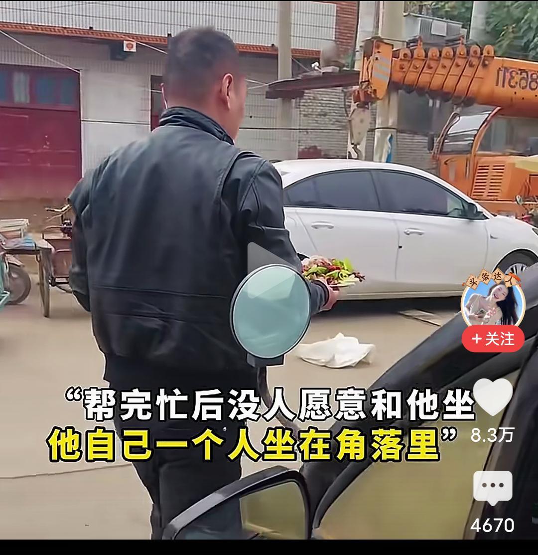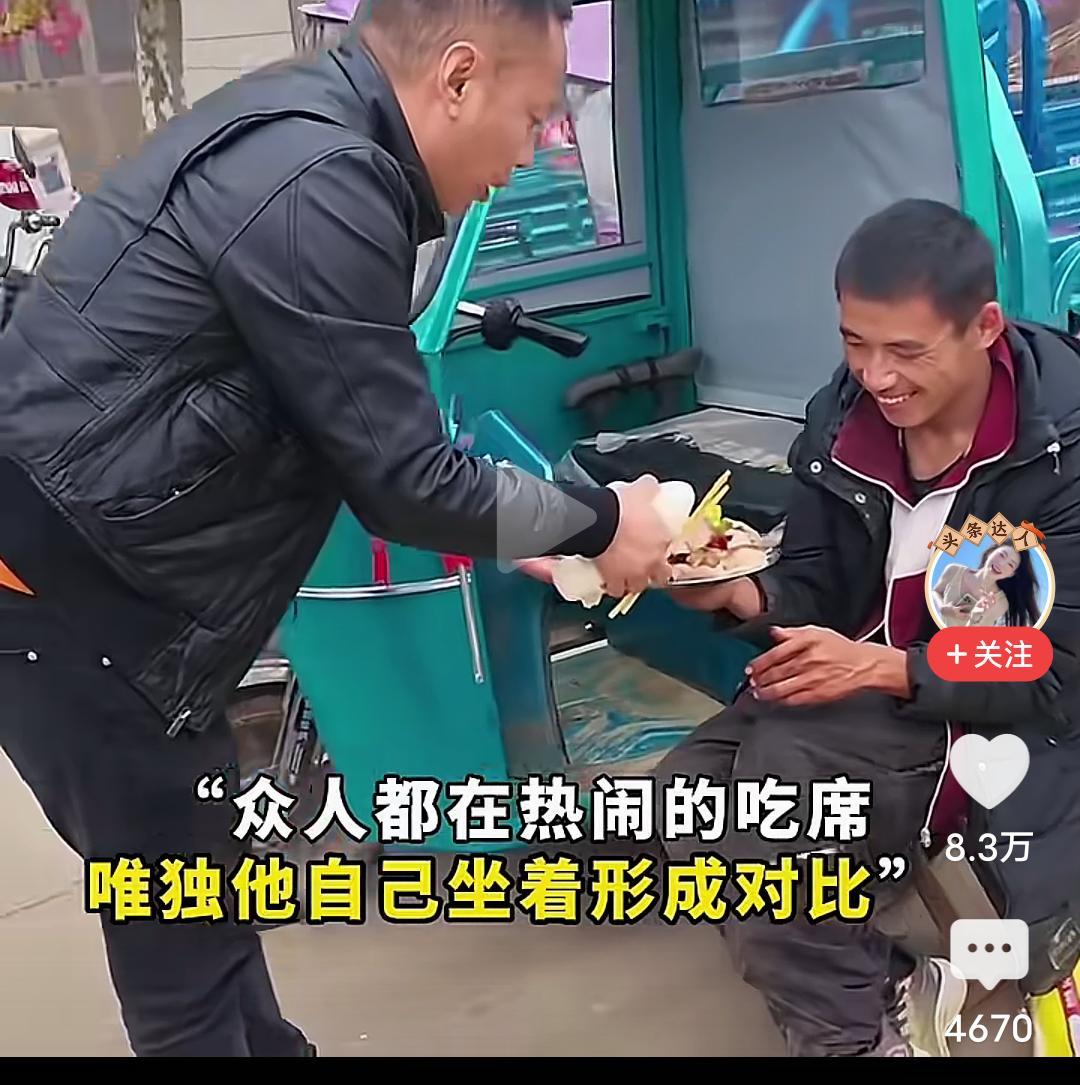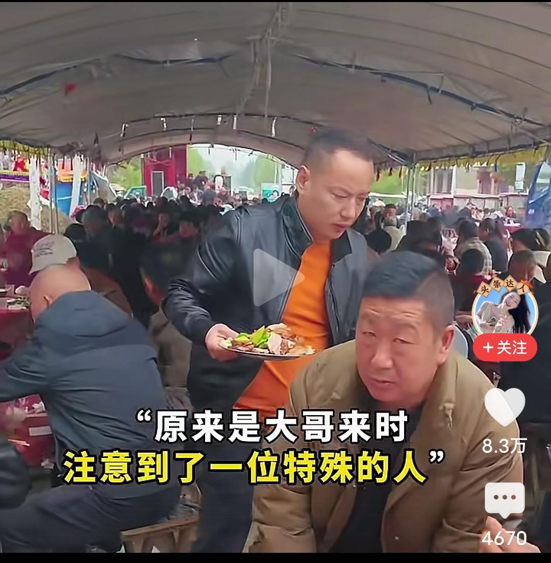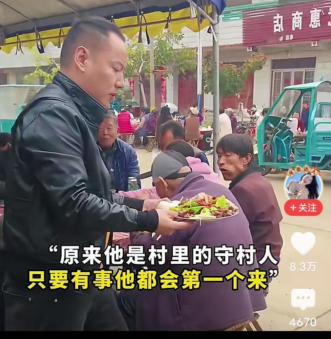 大哥,好人!点赞! 在农村的宴席上,这位大哥在菜上完后,往盘子里夹出来了一些菜。 原来在他来的时候,注意到了一位特殊的人,就是村里的守村人。 只要村子里谁家有事,他总是第一个来,帮完忙后没人愿意和他坐在一起,他就自己一个人坐在角落里。 大哥端着饭菜,径直走过去,原来大哥是在给守村人送饭菜。 众人都在热闹的吃席,唯独他一个人在角落里孤独的坐着。 守村人看到大哥送来的满满的饭菜,内心很开心,用一个简单的微笑来回应大哥内心的善良。 土地不会抛弃任何一粒种子,人间不该落下任何一双碗筷。 《山海经》有言,痴本智者,为守一方水土安宁,自丧一魂一魄转世为愚,除魑魅,荡魍魉,平阴阳,定五行,无人可比,无人可及。 守村人,守护着村子的平安,请善待他们。
