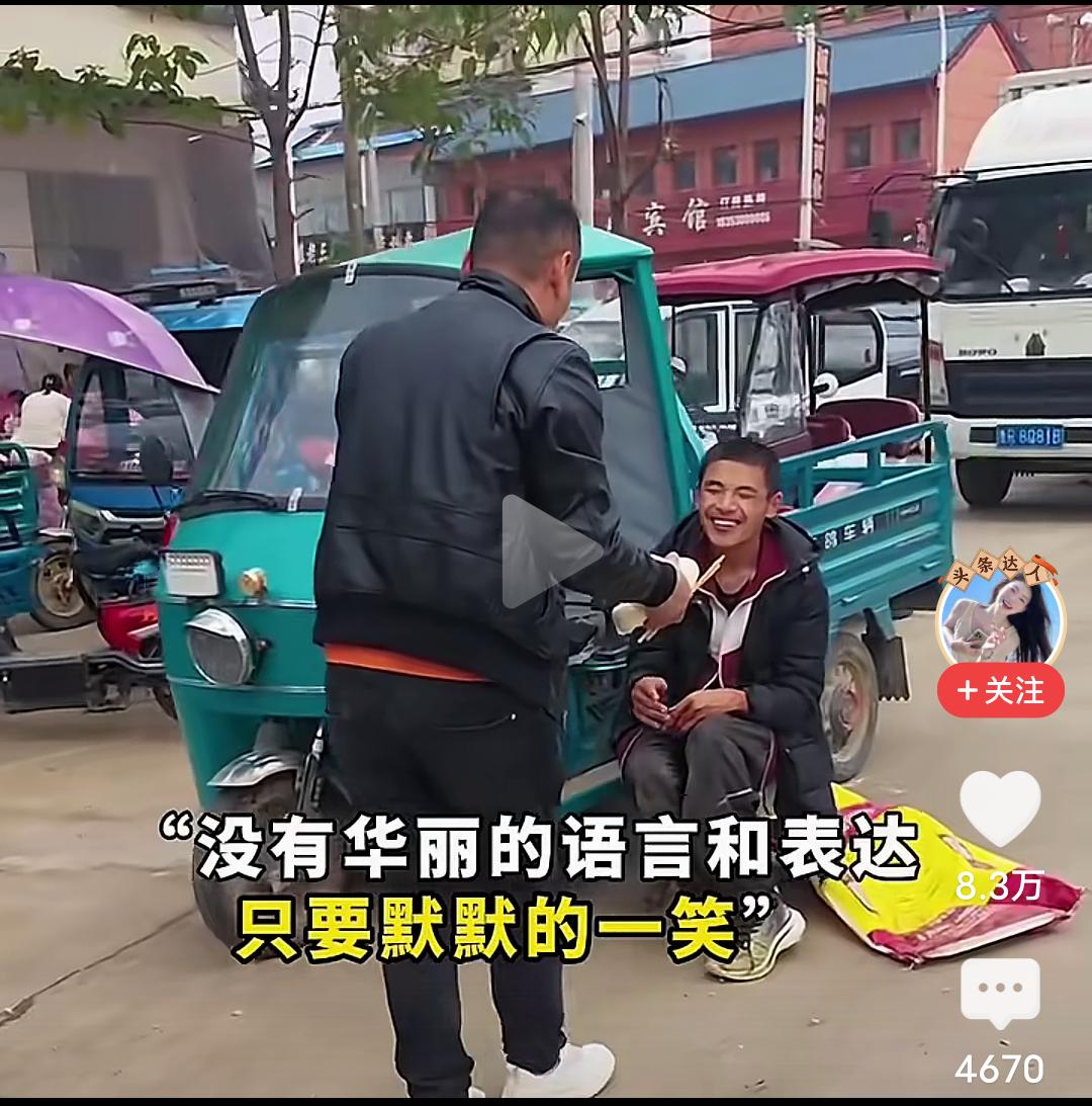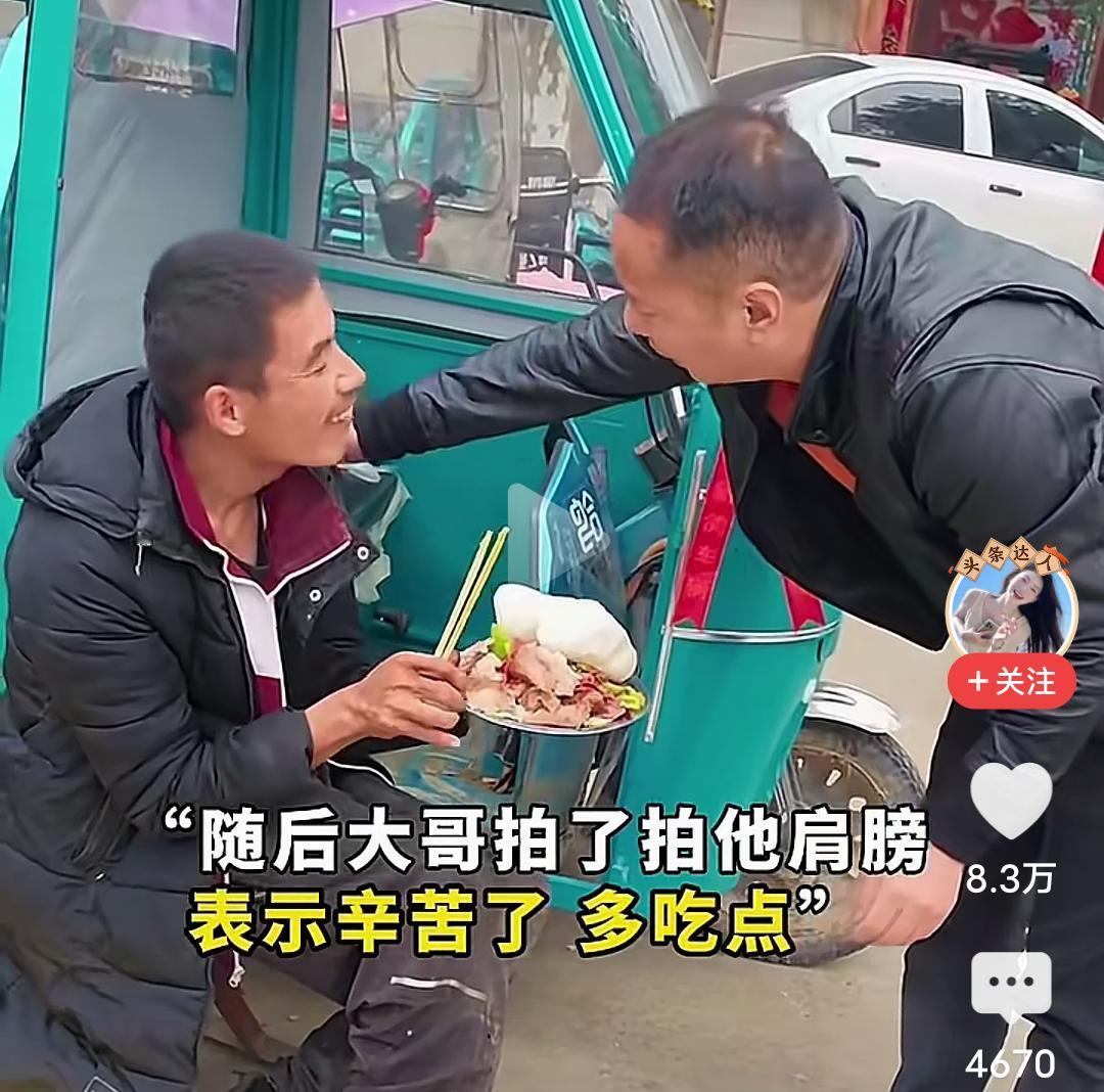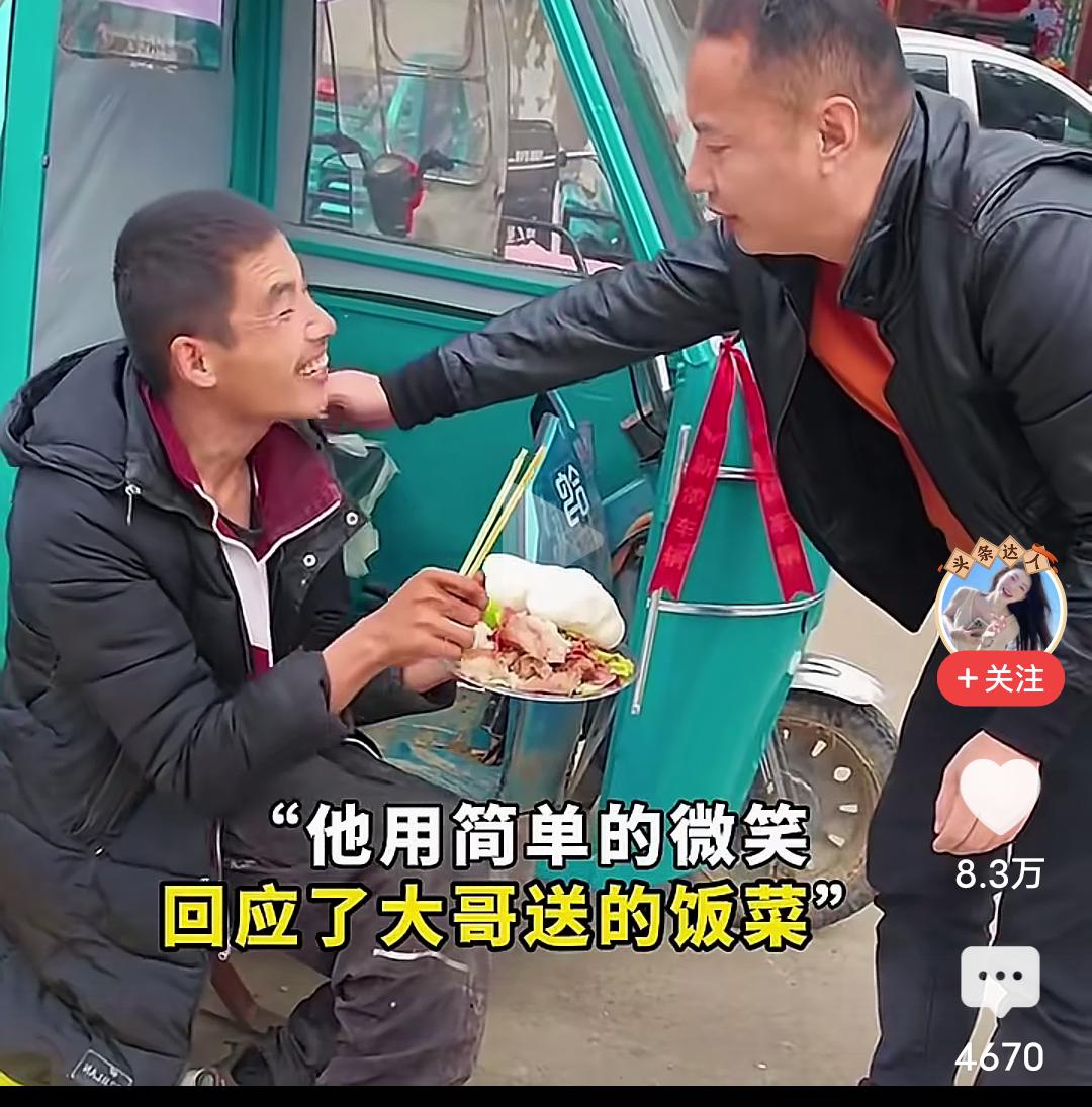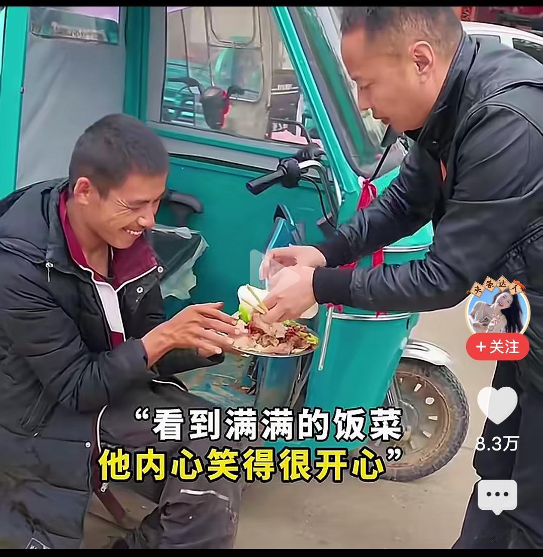 大哥,好人!点赞! 在农村的宴席上,这位大哥在菜上完后,往盘子里夹出来了一些菜。 原来在他来的时候,注意到了一位特殊的人,就是村里的守村人。 只要村子里谁家有事,他总是第一个来,帮完忙后没人愿意和他坐在一起,他就自己一个人坐在角落里。 大哥端着饭菜,径直走过去,原来大哥是在给守村人送饭菜。 众人都在热闹的吃席,唯独他一个人在角落里孤独的坐着。 守村人看到大哥送来的满满的饭菜,内心很开心,用一个简单的微笑来回应大哥内心的善良。 土地不会抛弃任何一粒种子,人间不该落下任何一双碗筷。 《山海经》有言,痴本智者,为守一方水土安宁,自丧一魂一魄转世为愚,除魑魅,荡魍魉,平阴阳,定五行,无人可比,无人可及。 守村人,守护着村子的平安,请善待他们。