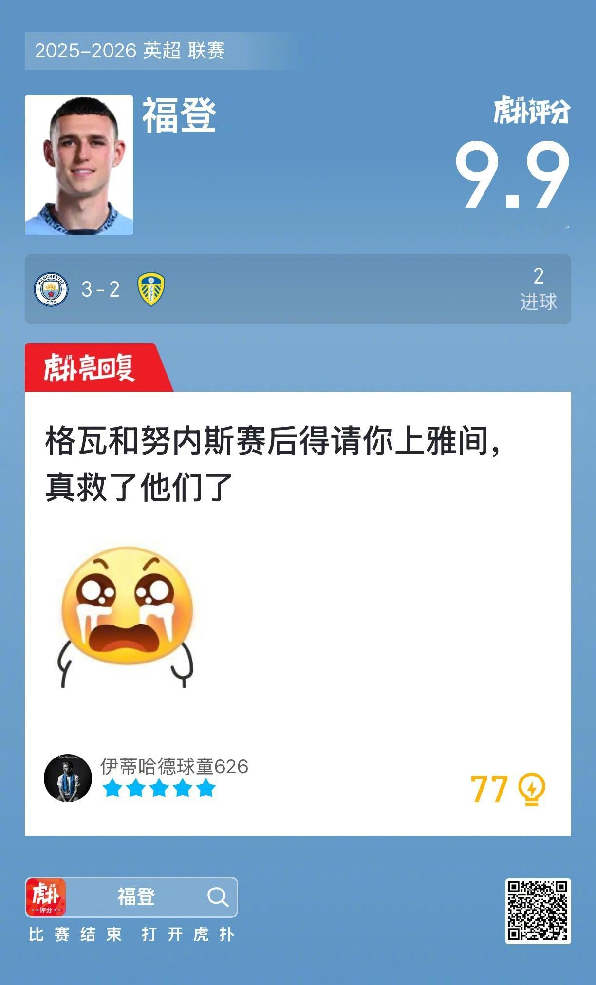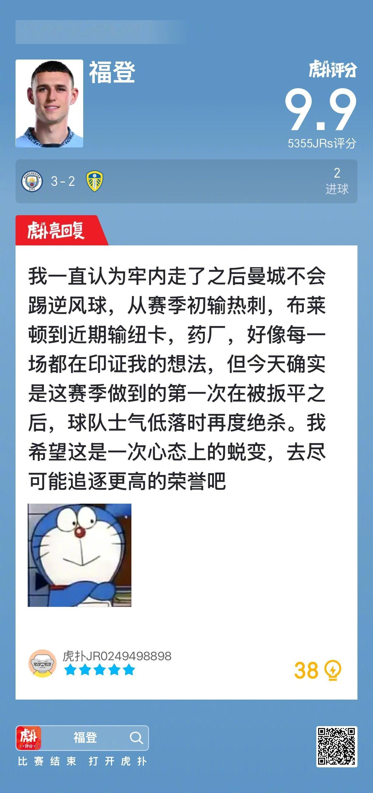 曼城3比2利兹联福登打进两球,赛后收获9.9的虎扑评分!