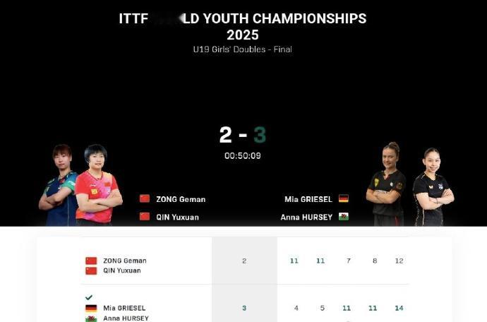 覃予萱纵歌曼世青赛U19女双亚军2025年国际乒联世青赛U19女双决赛,中国组合覃予萱纵歌曼2-3不敌跨协会组合格里塞尔/赫尔希,获得女双亚军,比分:11-4,11-5,7-11,8-11,12-14。 2025年国际乒联世青赛