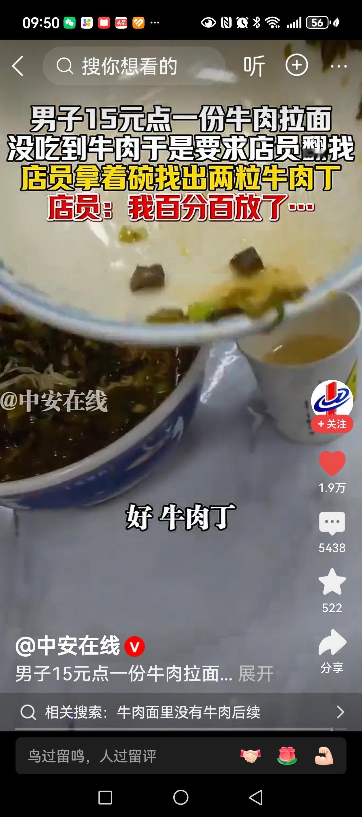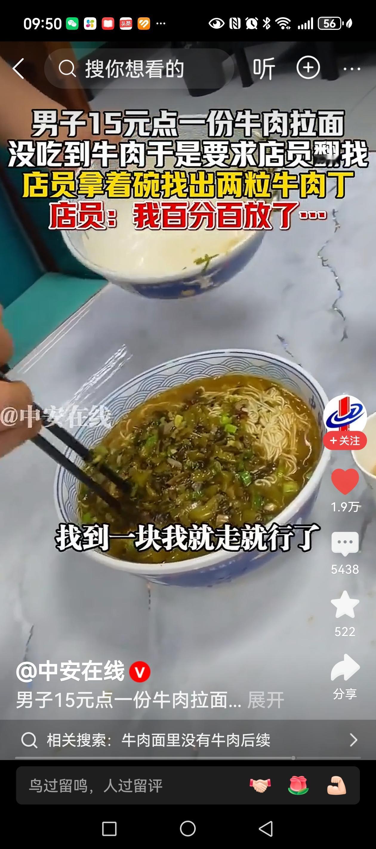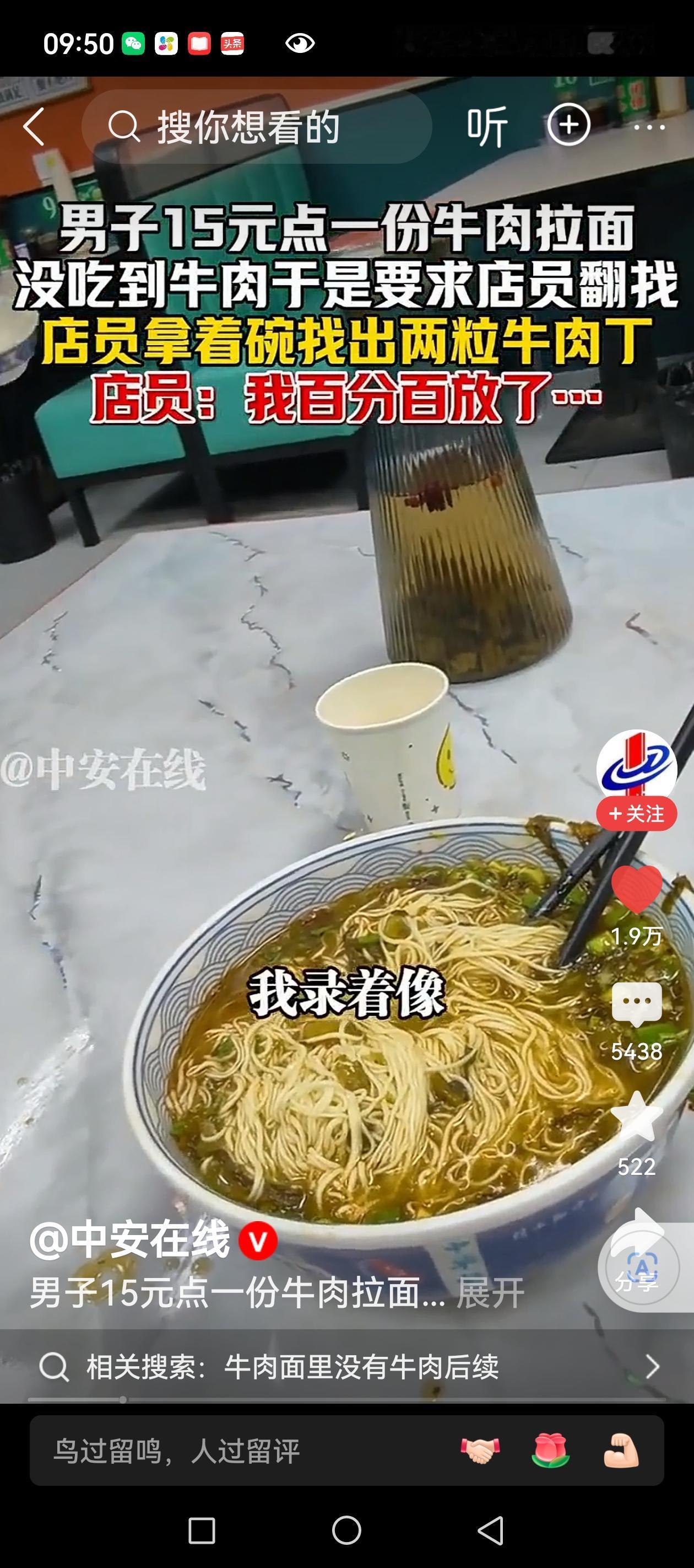 11月28日,一男子吃牛肉拉面,发现15元一碗的牛肉拉面里却找不到肉,与店员交涉,店员信心满满的说,我百分百放了牛肉,并且终于在碗中找到两颗黄豆粒大小的牛肉。 在我们当地,拉面馆8元一碗的牛肉拉面,大约也就有十几粒黄豆大小的牛肉,想加肉可以,薄薄的牛肉片,加肉的钱要比牛肉面还贵。快餐店里的牛肉面一般25元左右一碗,带一个鸡蛋和几大块牛肉。 其实,这些年吃牛肉拉面的感觉也就是吃面,牛肉的味道都在汤里了。