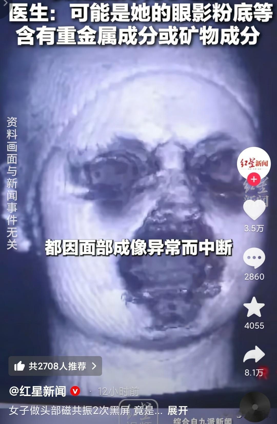 女子去医院做核磁共振, 意外发现自己的化妆品里面可能含有重金属。 因为头晕去医院做核磁共振,两次扫描都因为面部成像异常,导致成像中断,医生排除了假牙、纹眉、整形。 没想到是化了妆,洗了之后,成像就恢复正常,医生判断她的化妆品里面可能含有重金属成分。 这个钱花得值,不仅排查出病因,还查出了源头就是化妆品,就是不知道是哪一项重金属超标。