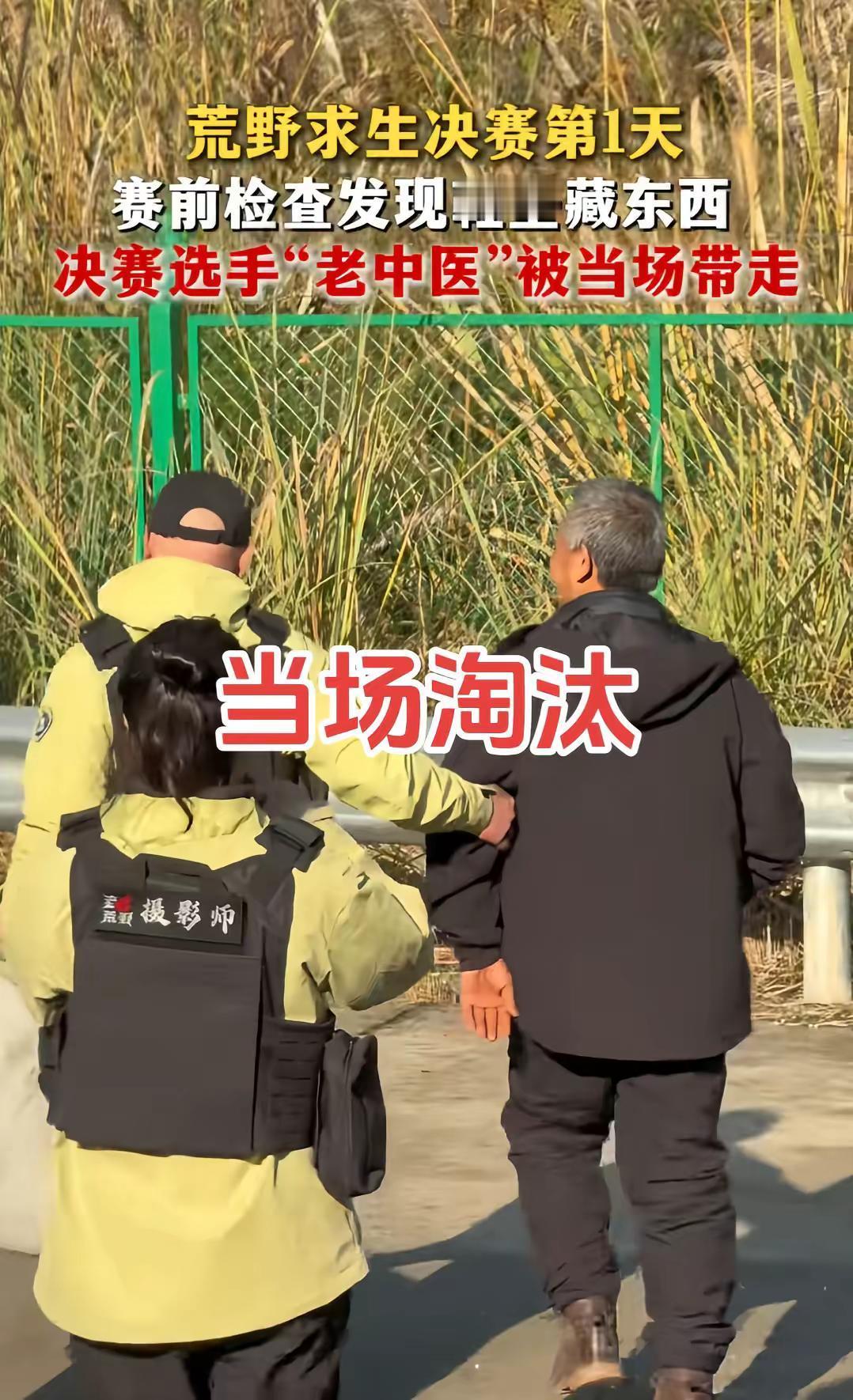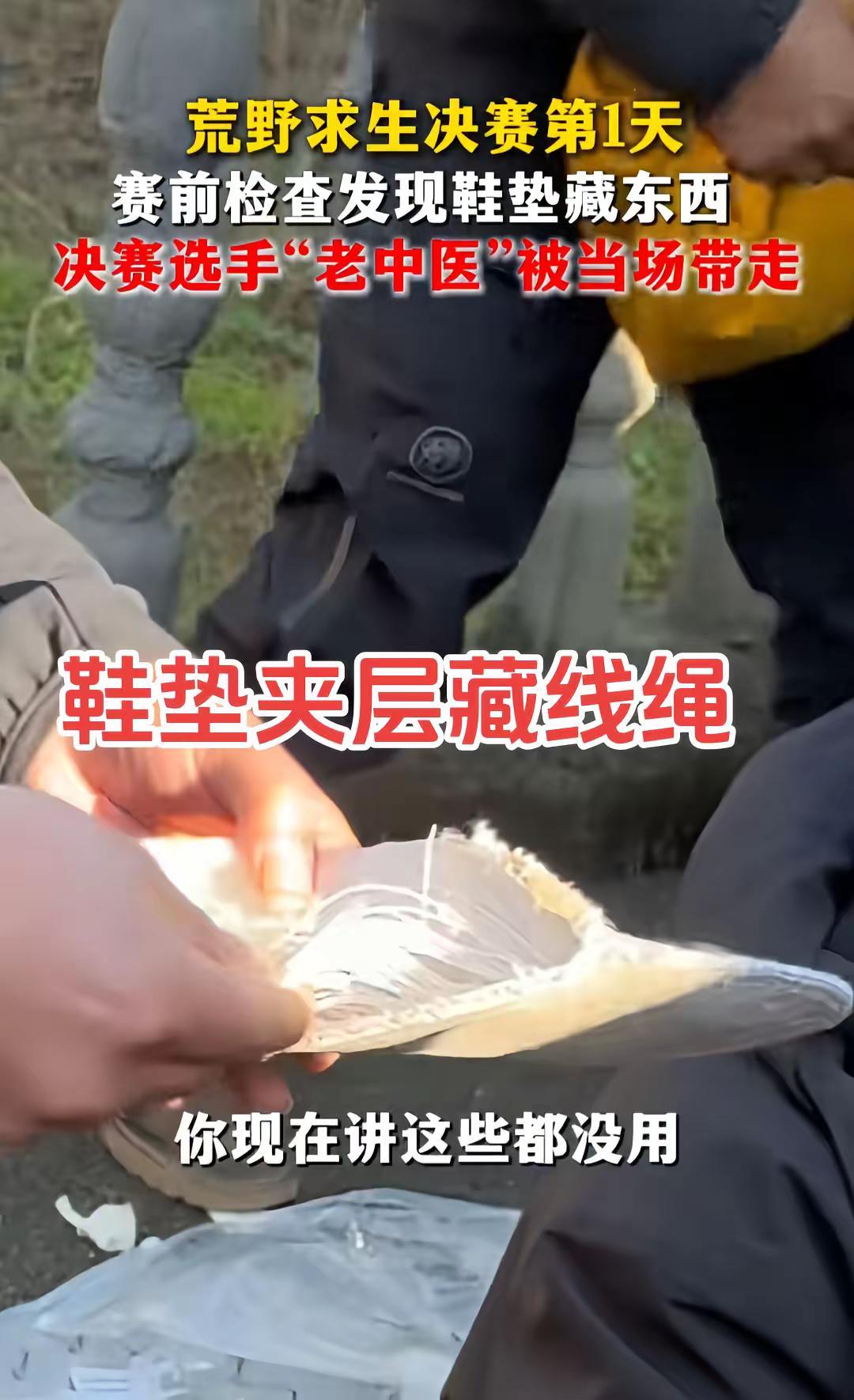 荒野求生决赛第一天就有选手淘汰。“老中医”在荒野求生比赛第一天检查装备时,从鞋垫夹层,检查出一段绳子,当场红牌罚下。