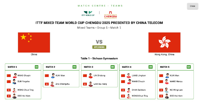 2025成都混合团体世界杯小组赛中国vs中国香港,对阵名单出炉: 第一盘混双:王楚钦孙颖莎vs黄镇廷杜凯琹第二盘女单:蒯曼vs朱成竹第三盘男单:林诗栋vs林兆恒第四盘男双:王楚钦梁靖崑vs黄镇廷陈颢桦 第五盘女双:王曼昱蒯曼vs杜凯琹吴咏琳