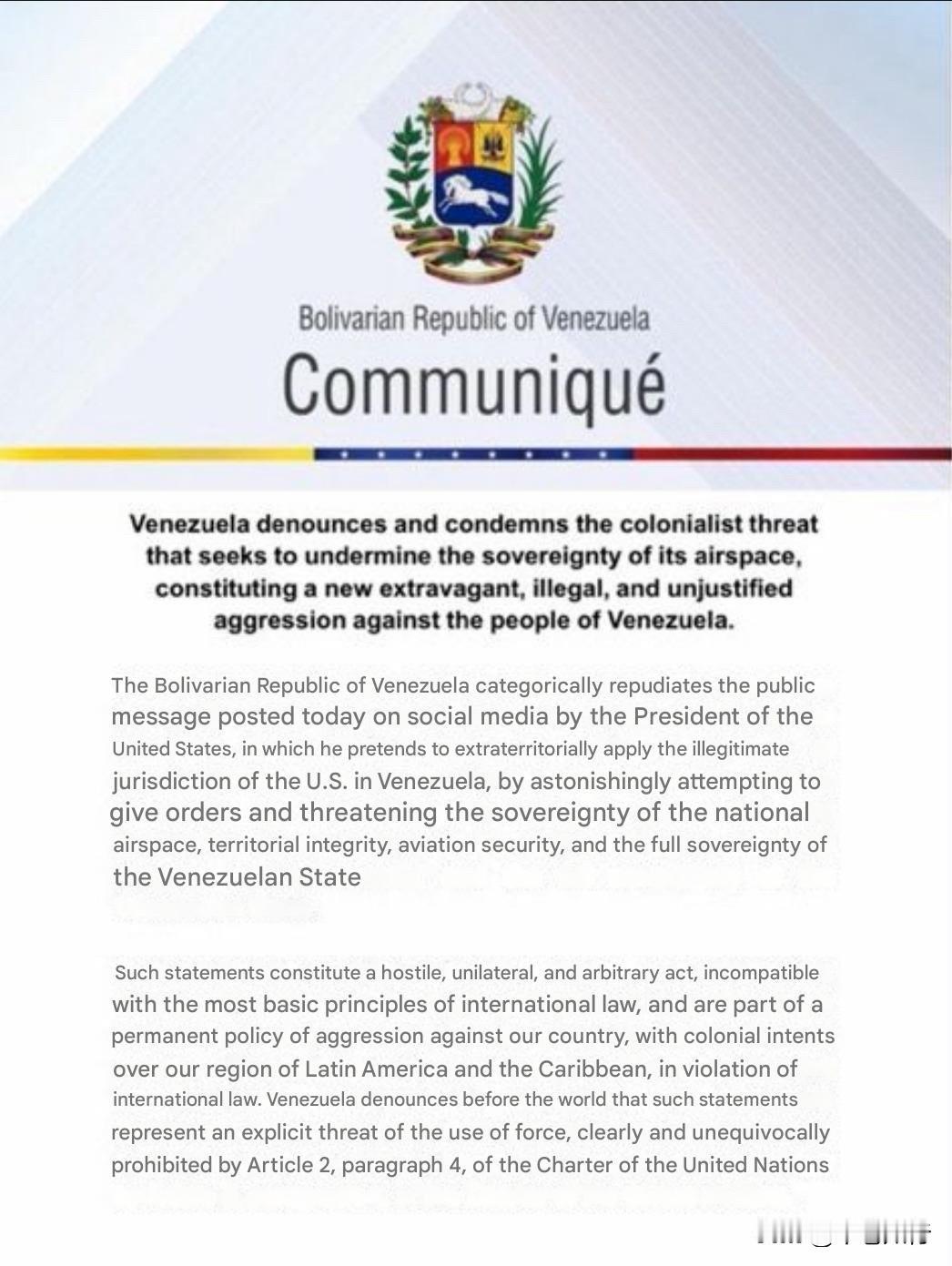 【一条推特就把独裁者吓得语无伦次,这画面太美】 马杜罗这帮人平时反美口号喊得震天响,川普刚说要封锁领空,他们立马就怂了,周末加班加点搬出《联合国宪章》来哭诉“霸凌”。 说白了,这帮人的命门就在那条贩毒洗钱的航线上。真要把路堵死,所谓的“反帝斗士”瞬间就变回了求饶的懦夫。在这个世界上,流氓政权只听得懂一种语言,那就是实力的碾压。别讲大道理,效果摆在这儿。