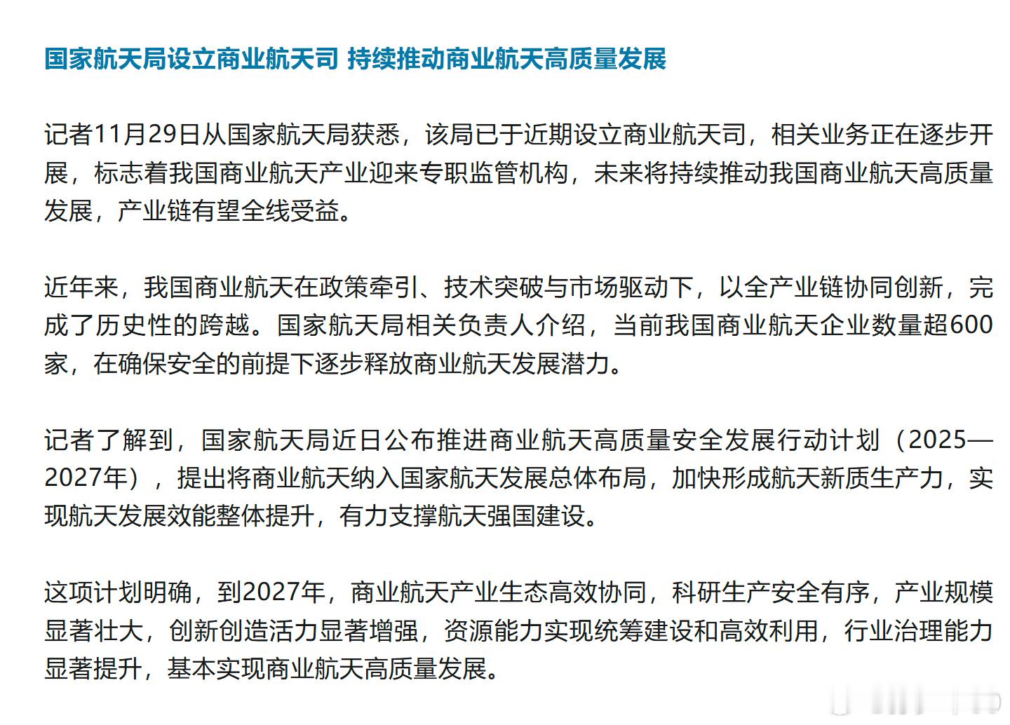 国家航天局设立商业航天司持续推动商业航天高质量发展