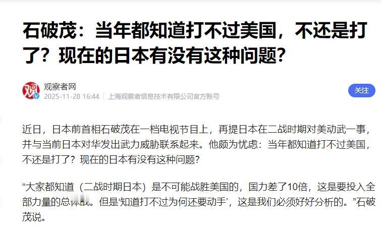 近日,日本前首相石破茂在接受一家电视台采访的时候说:当年(二战时期)日本和美国的国力相差十倍,明知道打不过美国还要打。东条英机说不试试怎么知道?当时没有人阻止,因为会被视为懦弱,反而认为同意打的有勇气。明知道必败为什么还要去试试?   石破茂的这番话算是戳破了日本骨子里的那点侥幸心理,当年跟美国死磕是如此,现在对着中国蠢蠢欲动也是同一个路数。   二战时的日本早就把 “不见棺材不落泪” 刻进了骨子里,明明两国国力的鸿沟大到能淹死航母,却硬是被 “不试试怎么知道” 的疯话冲昏了头,谁要是敢说个不字,立马就被贴上懦弱的标签,反倒那些喊着要打的人被捧成了勇士,这种扭曲的氛围让整个国家一头扎进了必败的泥潭。   1941 年的日本工业产值才 90 亿美元,而美国足足有 2000 多亿美元,相当于日本的 20 倍还多,钢铁产量更是被甩开 15 条街,美国年产 3300 万吨,日本连 200 万吨都凑不齐,就算把从东北抢夺的物资算上,也才勉强摸到 500 万吨的边。   石油这种战争命脉就更不用说了,美国当年年产 2 亿吨,日本自己只能挖 37 万吨,90% 以上都得从美国进口,后来美国一禁运,日本的军舰、飞机立马就成了没油的铁疙瘩。   可就是这样的家底,日本还敢偷袭珍珠港,靠着 6 艘航母和 400 多架舰载机搞突然袭击,虽然一时把美军打懵了,炸沉了 4 艘战列舰,死伤 2400 多人,但他们忘了美国的工业机器一旦转起来有多恐怖。   美国当年一年就能造 238 万辆汽车,是日本的 14 倍,坦克年产 4 万多辆,日本才 1000 多辆,飞机产量更是日本的 5 倍以上,这种差距下,日本的胜利只能是昙花一现,没过多久就被美军按在太平洋上反复摩擦,直到两颗原子弹落下才彻底清醒。   日本当年之所以敢铤而走险,还有个重要原因是北上侵苏碰了一鼻子灰。   1939 年在诺门罕草原,日军想复制九一八的套路偷袭苏蒙联军,结果被朱可夫带着优势装备胖揍一顿,从此再也不敢打苏联的主意,只能转头南下抢东南亚的资源,而珍珠港作为美国在太平洋的核心基地,就成了他们必须拔掉的钉子。   可他们忘了,美国不是苏联,更不是当年积贫积弱的国家,这种以卵击石的操作,本质上就是赌徒输红了眼后的孤注一掷,只不过他们赌的是整个国家的命运。   现在的日本看着中国,又犯了当年的老毛病,却没看清如今的差距比二战时还要悬殊。   2024 年中国 GDP 已经达到 18.74 万亿美元,日本才 4.03 万亿美元,中国是日本的 4.65 倍,要是按购买力平价算,差距直接扩大到 6 倍。   军费方面中国更是碾压,2500 亿美元的预算是日本 589 亿美元的 4.2 倍,现役兵力中国有 203.5 万,日本自卫队才 24.7 万,预备役更是差了 91 倍,这样的兵力规模,就算日本想 “爆兵” 也根本追不上。   而且,中国已经有了 3 艘航母,其中福建舰还是电磁弹射,能搭载隐身舰载机和预警机,形成完整的作战体系,而日本所谓的 4 艘 “出云级” 不过是准航母,排水量才 2.7 万吨,连远洋护航和空中预警的配套都没有,说是 “跛脚防御平台” 都抬举它了。   中国光是歼 - 20 隐身战机就有 300 架,三代半战机上千架,而日本的 F-35 还没凑够 150 架,主力 F-15J 机龄都超 30 年,可用率才 62%。   日本的军工体系核心技术全靠美国授权,武器进口 97% 都流向美国,10 式坦克的主炮一年才产 15 门,这样的产能别说打仗,就算是应对小规模冲突都够呛。   更要命的是日本 95% 的能源都依赖进口,海上生命线一旦被切断,用不了多久就会丧失持续作战能力,而中国的区域拒止能力早就今非昔比,东风 - 21D 反舰弹道导弹被称为 “航母杀手”,让日本的海上力量根本不敢靠近。   当年日本跟美国打,好歹还能靠偷袭赚点短期优势,现在对着中国,连偷袭的机会都没有,中国的北斗导航、空警 - 500 预警机和全域后勤保障网络,能让任何挑衅行为都被提前察觉并反击。   二战时日本战败不过是挨了两颗原子弹,丢了海外殖民地,现在要是真敢 “试试”,面对的将是全方位的碾压,不仅军事上会一败涂地,经济上也会因为贸易反制彻底崩盘,毕竟日本的汽车、半导体等支柱产业高度依赖中国市场,新能源汽车 70% 的动力电池和 90% 的稀土材料都要从中国进口,真到了那一步,可比二战的下场惨多了。