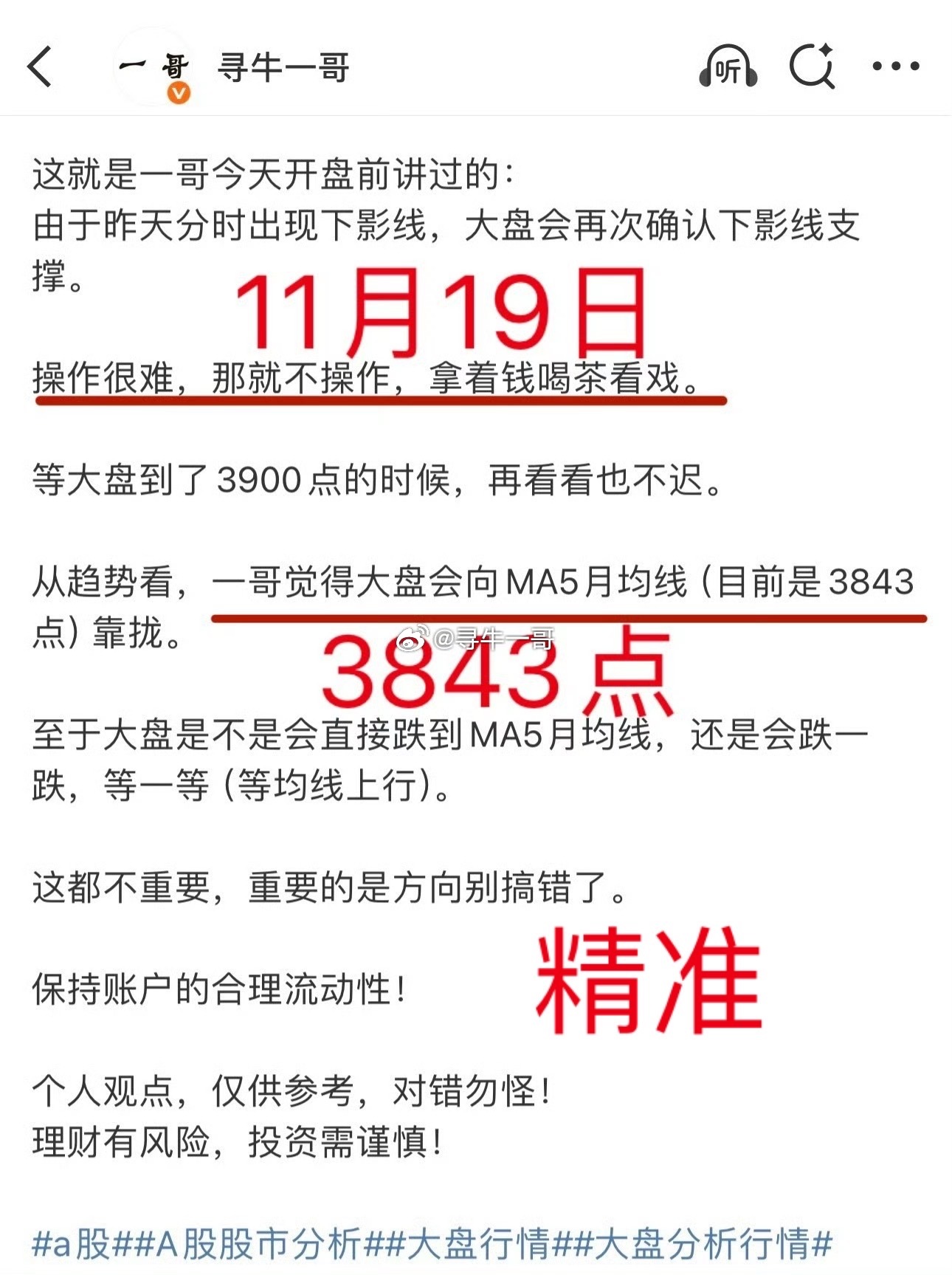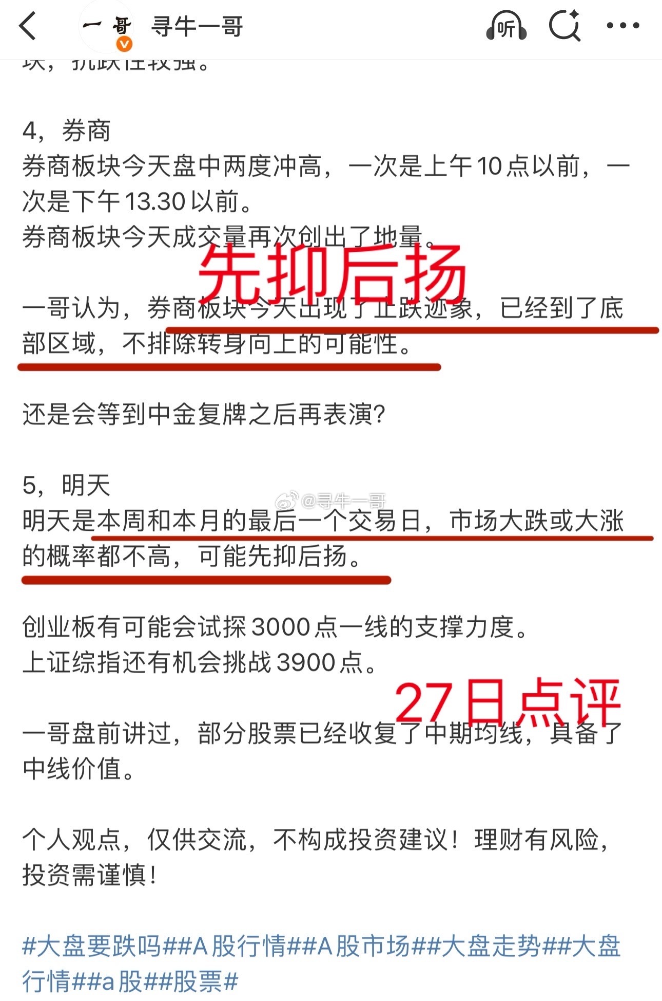 A股:横多长竖多高,下周做两手准备。长期趋势线逐渐上行,大盘有望成功构筑中期底部。1,利多分时趋势是个横向整理的态势,在市场成交量缩减的情况下,能维持这种状态实属不易。在上周五探底回踩了短期均线之后,市场向上的底气足了一些。PS:一哥周四盘后提醒大盘倒车,同时预测大盘可能先抑后扬(守住短期均线)。从日K线组合来看,周四是上影小阳K线,周五是带下影阳K线,而且周五收盘(3888.60)在周四开盘点位(3875点)上方。这种K线组合(有些人视为揉搓线),可以视为短线洗盘,预示着大盘短线是具备继续向上能力的。2,利空大盘在缩量的情况下,维持横盘状态不易,但换个角度来看,成交量缩小对市场上行高度构成了限制。目前无论是深成指还是上证综指,都还在中期均线(MA20和MA30均线)之下运行。而且,MA20均线逐渐与MA30均线靠拢,深成指和创业板的MA20和MA30均线已经粘合。这对大盘上行也会构成一定限制。3,中期一哥在11月19日的时候,预测大盘会迈向3843点,这个区域是当时大盘MA5月均线区域。随着大盘下跌,目前MA5月均线已经到了3831点(本月最低3816点)。PS:彼时上证综指3946点。更早一些的时候(11月14日),一哥从深成指和创业板的弱势状态分析,判断深成指和创业板指会迈向MA20周均线,深成指会考验13000点一线支撑,而创业板指会跌破3100点。PS:彼时深成指13216点,创业板指3111点。目前深成指MA20周均线位于12367点,创业板指MA20周均线位于2813点。创业板指上周最低2892点,收盘3052点。深成指上周最低12448点,收盘12984点。从上述数据可以看到。创业板和深成指上周的最低点与MA20周均线相差不大,而且MA20周均线还处在上行趋势。上证综指虽然一度跌破了MA5月均线,但守住了。守住了长期趋势线,那么市场成功构筑中期底部的概率就会提高。综述:短线有向上机会,但要谨防回踩,下周要做两手准备。中期底部渐行渐近。上述为纯技术分析,仅供交流,不构成投资建议!理财有风险,投资需谨慎!大盘分析行情K线图分析今日看盘a股