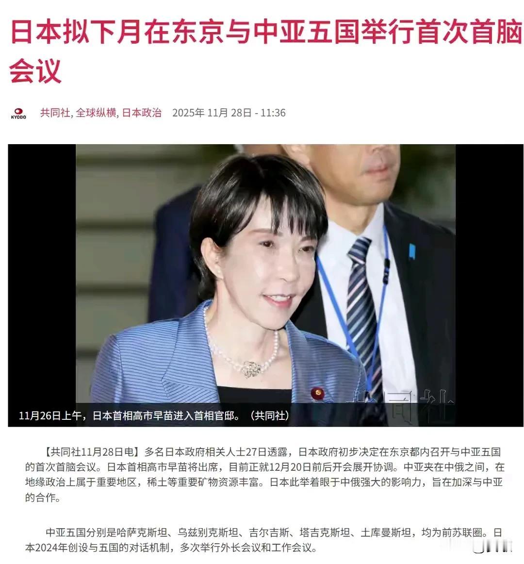 高市早苗花样百出.强拉中亚围堵中俄 最近,日本的政治人物高市早苗突然动作频频,她在国际舞台上的举动,让很多人都觉得有点不寻常。特别是她在中亚地区的“布局”,让人不禁猜测,日本到底在打什么算盘。 中亚五国就是哈萨克斯坦、乌兹别克斯坦、土库曼斯坦、吉尔吉斯斯坦和塔吉克斯坦这五个国家。它们地处欧亚大陆的心脏地带,资源丰富,战略位置重要。 日本宣布要在东京搞一个中亚五国的领导人峰会。这可是历史上第一次,日本用这么高规格的方式邀请这些国家,目的很明确: 一方面,想借这个机会多搞点合作,比如能源、基础设施、绿色环保啥的;另一方面,也希望借此“拉拢”这些国家,减少中国和俄罗斯在这片地区的影响力。 中亚资源丰富,尤其是稀土、石油、天然气、铀矿……这些都是现代工业和“绿色转型”必不可少的“硬核”材料。日本自己也很依赖这些资源,特别是稀土,这关系到它未来的科技和能源安全。 高市早苗的如意算盘 资源合作:借助中亚丰富的矿产,减少对中国的依赖。 技术援助:帮这些国家搞基础设施,建电站、修铁路,增强合作关系。 政治影响:通过高规格的峰会,把自己打造成“中亚地区的朋友”,让这些国家觉得日本是个“值得信赖”的伙伴。 日本的“心思”是不是太明显? 当然啦,别忘了,日本还试图把这次峰会变成“领导人级别”的对话,把自己包装成“区域大佬”,在“印太规则”里占点位置。这分明是在给中国和俄罗斯制造麻烦,想在区域内多划点地盘。 中国和俄罗斯都觉得日本这波操作很危险。俄罗斯甚至公开说,日本在部署“进攻性武器”,威胁邻国安全;中国也指出,日本在出口“杀伤性武器”,试图突破“和平宪法”的限制,重新走上军国主义的老路。 这些国家虽然想借助大国的力量发展,但也要小心别被卷入大国的“角力”中。毕竟,谁都不想成为大国博弈的牺牲品。 日本现在像个“搅局者”,想借资源、借影响力,打造自己在中亚的“朋友圈”。但中俄都在警惕,提醒这些国家别被“糖衣炮弹”迷惑。谁能在这场大国博弈中占得上风,还得看怎么拿捏了。