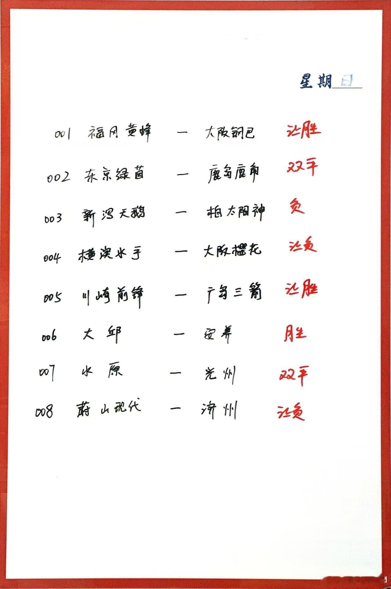 11月30日001 福冈黄蜂VS 大阪钢巴002 东京绿茵Vs 鹿岛鹿角003 新泻天鹅Vs 柏太阳神004 横滨水手 Vs 大阪樱花 005 川崎前锋VS 广岛三箭006 大邱 FC VS 安养 FC 007 水原 FC Vs 光州 FC 008 蔚山现代 VS 济州 SK FC 009 麦克阿瑟 VS 珀斯光荣010 全北现代vs FC 首尔011 江原 FC vs 浦项制铁012 金泉尚武vs 大田市民