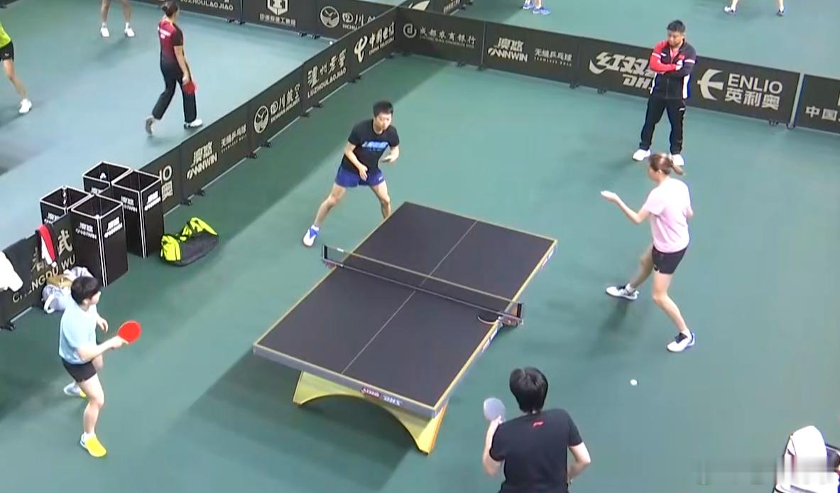 2025成都混合团体世界杯 训练馆孙颖莎和王楚钦在一起训练陪练是袁励岑和陈熠王皓马琳陪同看来第一场比赛孙颖莎和王楚钦应该是要搭配混双了