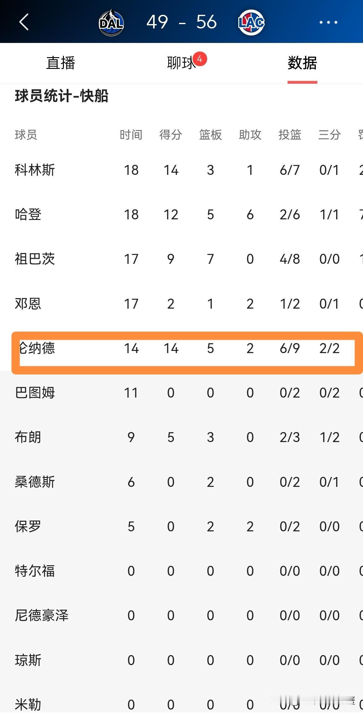 快船超级球星伦纳德的进攻效率真是太高了!在今天快船主场迎战独行侠的比赛中,目前双方的上半场比赛已经结束,快船暂时以56:49领先对手。在前两节比赛中,伦纳德首发出战14分钟,投篮9中6,其中三分球2中2非常高效的得到14分5篮板2助攻。 如果伦纳德能够在下半场比赛中延续这样的出色表现,那么快船一定会赢下本场比赛。