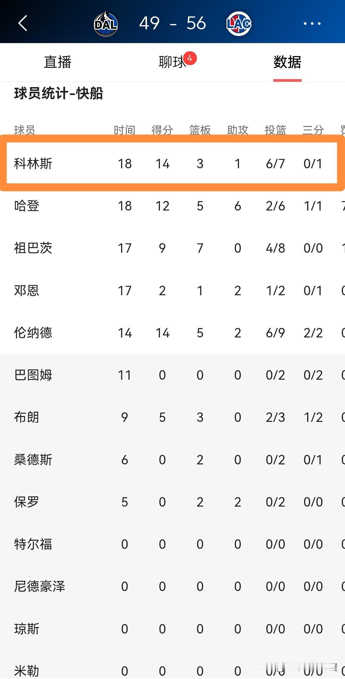 快船大将科林斯终于支棱起来了!在今天快船主场迎战独行侠的上半场比赛中,科林斯首发出战18分钟,投篮7中6,其中罚球2中2非常高效的砍下14分3篮板,他的场上正负值为+15。 坦白说,科林斯绝对是快船能够在上半场比赛结束时保持领先的最大功臣,他在攻防两端都为球队提供了非常大的帮助。
