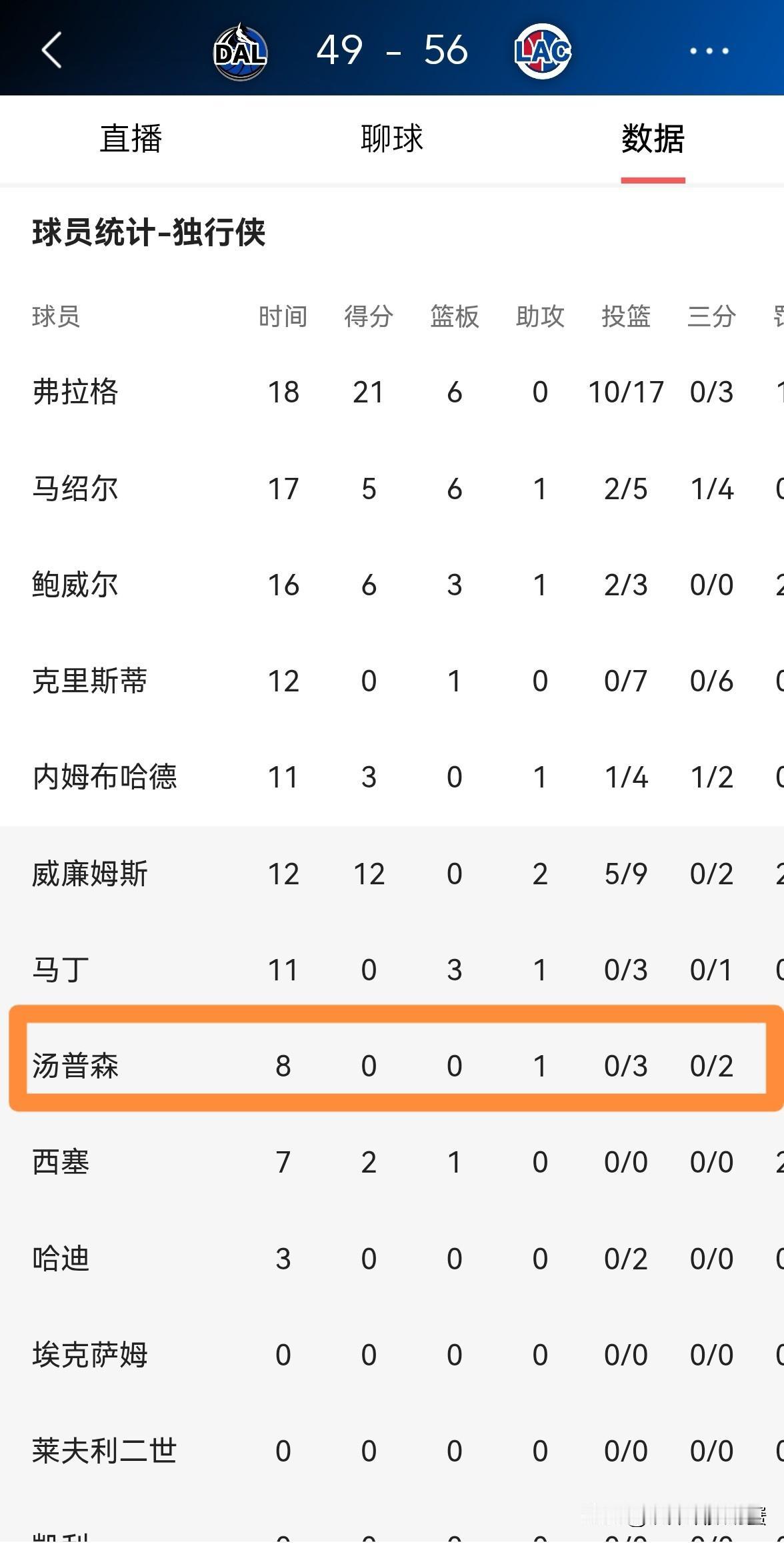 我真的受不了独行侠老将汤普森了!在今天独行侠客场挑战快船的比赛中,目前双方半场战罢,独行侠以49:56落后于对手。在上半场比赛中,汤普森手感冰凉,他替补出战8分钟,投篮3中0,其中三分球2中0怒砍0分。 作为NBA历史上最伟大的射手,汤普森在比赛中打出这样糟糕的表现真是太丢人了。