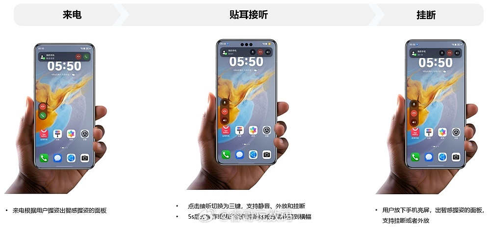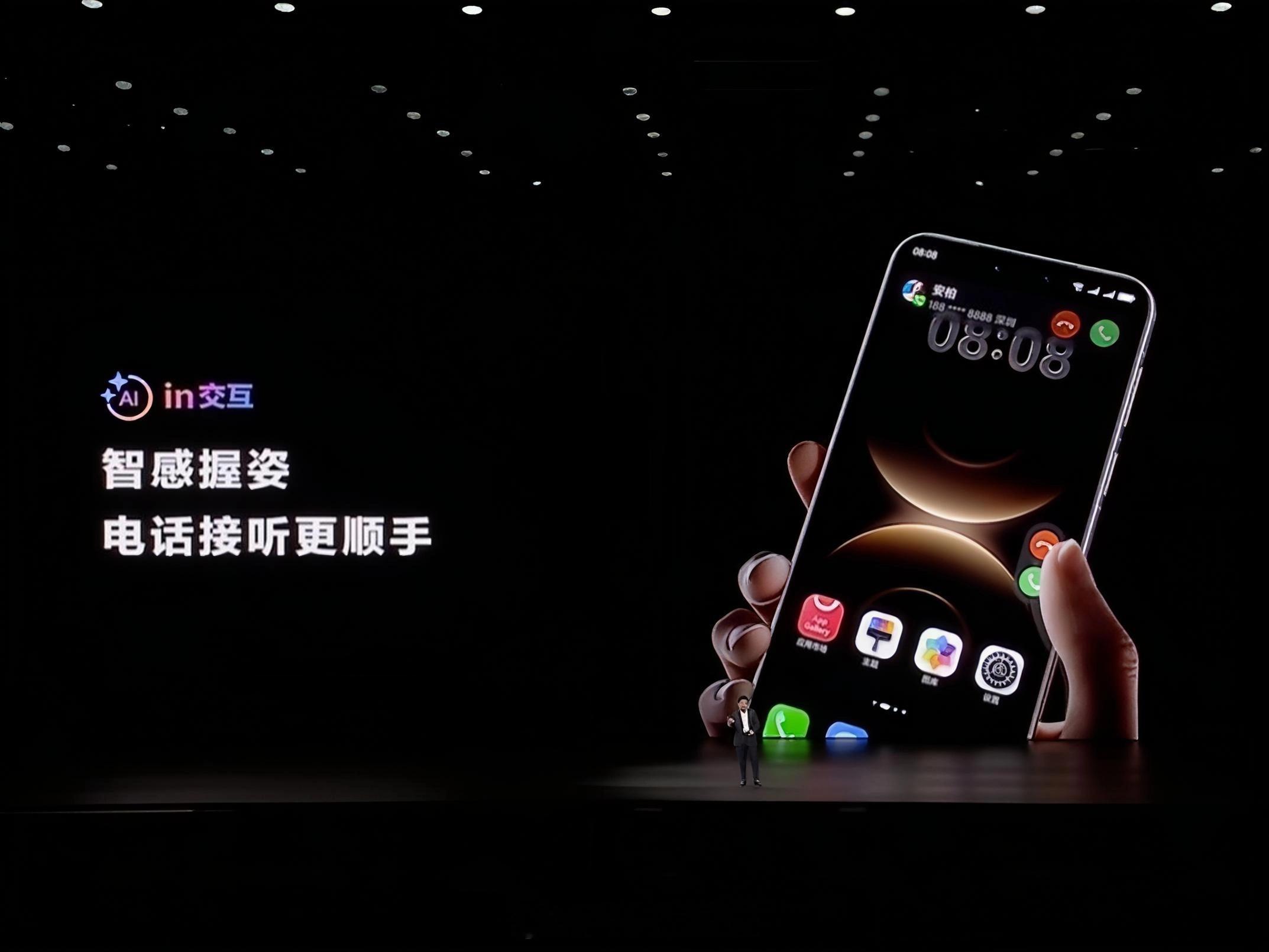 华为Mate80系列、MateX7系列机型首发的“智感握姿”功能很有意思,单手使用可以AI识别大拇指位置,并就近显示功能按钮。目前已经支持电话、畅连以及 微信、钉钉、飞书、企业微信、抖音的语音视频,后续会适配更多机型。华为Mate80华为MateX7HarmonyOS6
