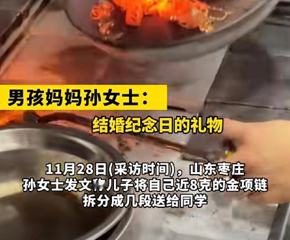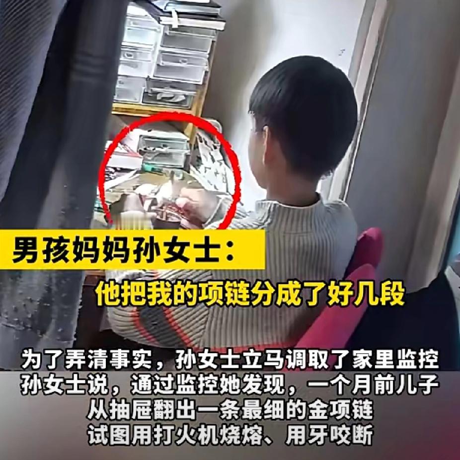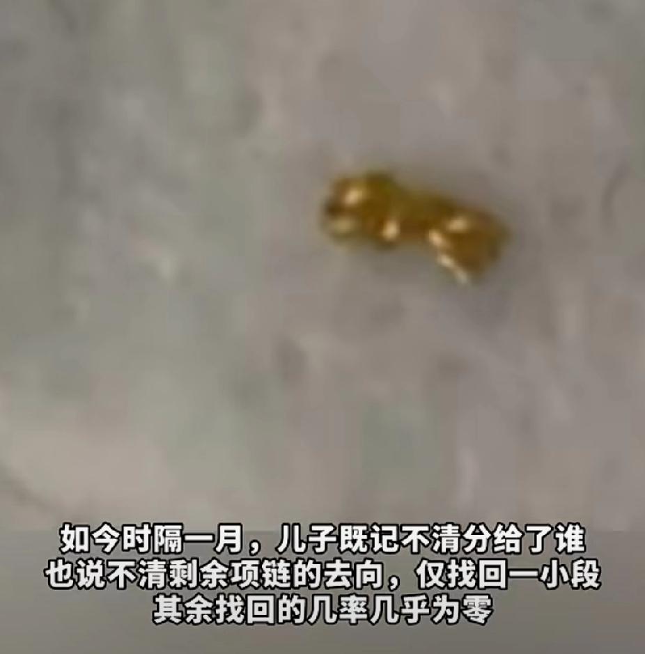 11月28日,山东枣庄的孙女士发视频称:自己8克多的金项链被儿子分成一点点分给了同学,目前只找回了很少一部分,剩下的估计找回的希望很渺茫了! 孙女士没想到这样戏剧化的事情竟然会发生在真实生活中,而且就发生在自己的身上。 这条项链是丈夫送给自己的结婚纪念日礼物,项链被儿子拆分给同学,自己竟然还是从儿子一个女同学的妈妈那里听到的。 为了弄清楚儿子的整个作案过程,孙女士和丈夫连夜查看家中监控,发现在一个月前,儿子从家中抽屉中拿出了那条最细的金项链,尝试用打火机烧、用刀切等多种方式拆分。 拆分成功后,先后送给了多名同学,因为已经过去一个月的时间,具体送给了谁,大家也都不记得了,最后只找回了很少的一部分! 哈哈,没想到吧!这么小的孩子竟然会对黄金有概念,还知道金子很贵,不能送太多,所以拆分成了很多段送人! 所以,千万不要低估家中年幼的孩子,他们懂得很多!网友建议:“还是给他一个完整的童年吧!”
