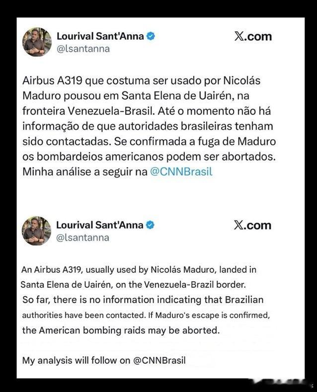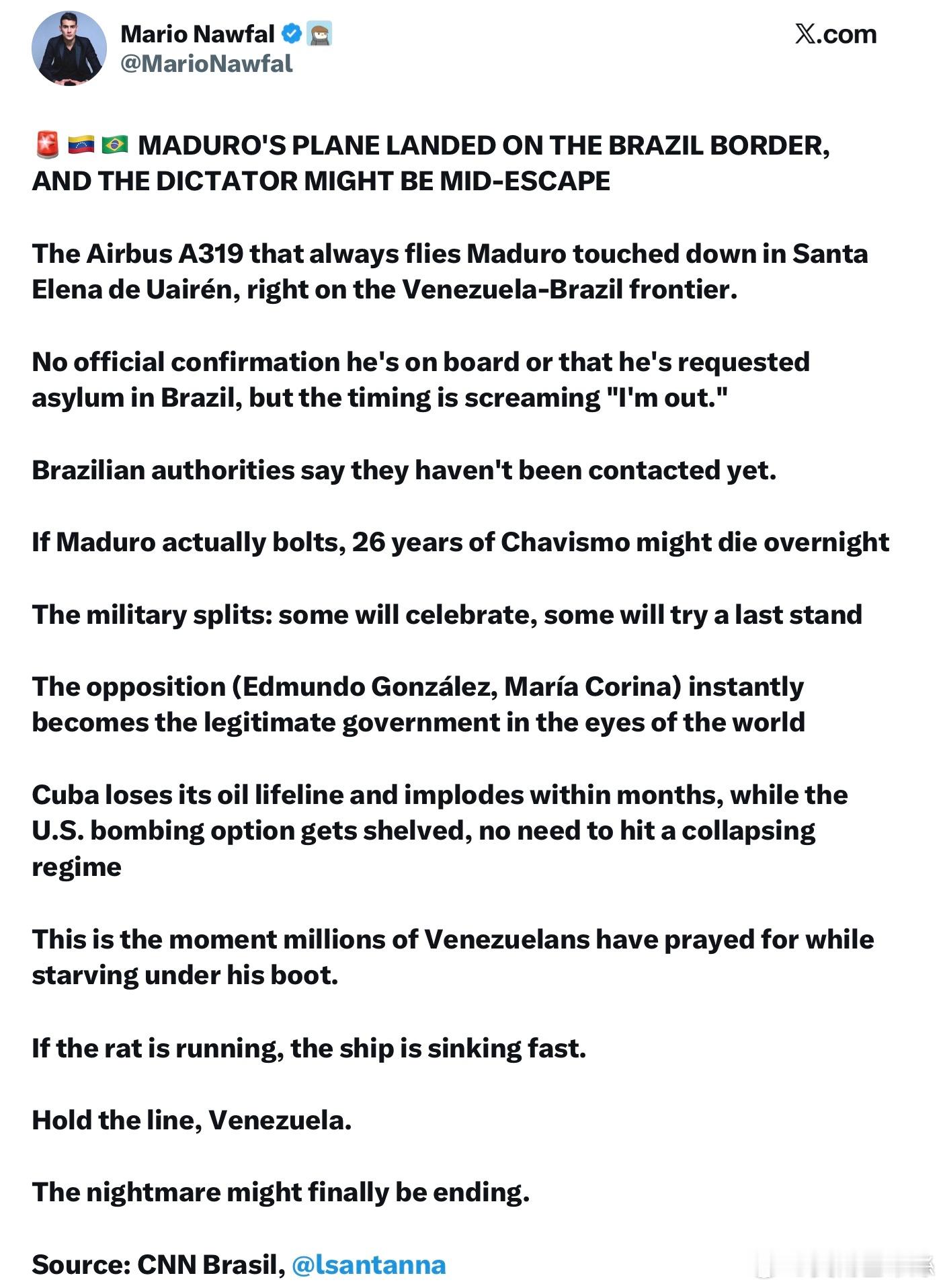 馬杜羅的飛機降落在巴西邊境,這位毒菜者可能正在逃亡途中。馬杜羅的專機——一架空客A319——降落在委內瑞拉和巴西邊境的聖埃萊娜·德·烏艾倫。雖然沒有官方消息證實他已登機或已向巴西申請庇護,但時機表明“我要出局”。巴西當局表示尚未接到聯繫。如果馬杜羅真的下台,查韋斯主義26年的統治可能一夜之間就終結。 軍方分裂:一部分人將慶祝勝利,一部分人將進行最後的抵抗 反對派(埃德蒙多·岡薩雷斯、瑪麗亞·科里納)在世人眼中瞬間成為合法政府。 古巴失去石油命脈,數月內便土崩瓦解,而美國的轟炸選項也被擱置,因為沒有必要打擊一個搖搖欲墜的政權。 這是數百萬委內瑞拉人在遭受他的鐵蹄蹂躪、忍飢挨餓時一直祈禱的時刻。如果老鼠在奔跑,船正在迅速下沉。委內瑞拉,堅守陣地。噩夢或許終於要結束了。來源:CNN巴西頻道