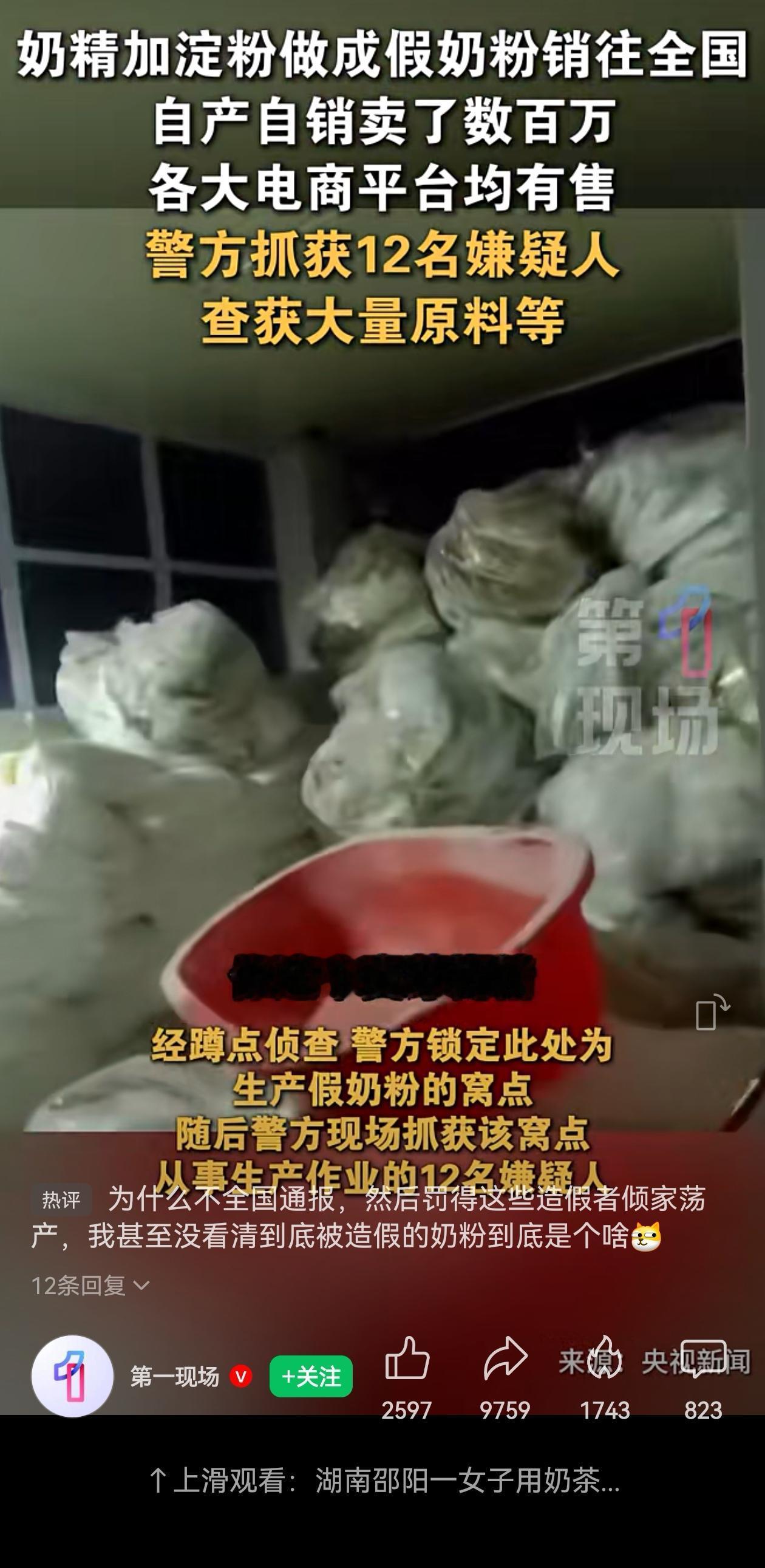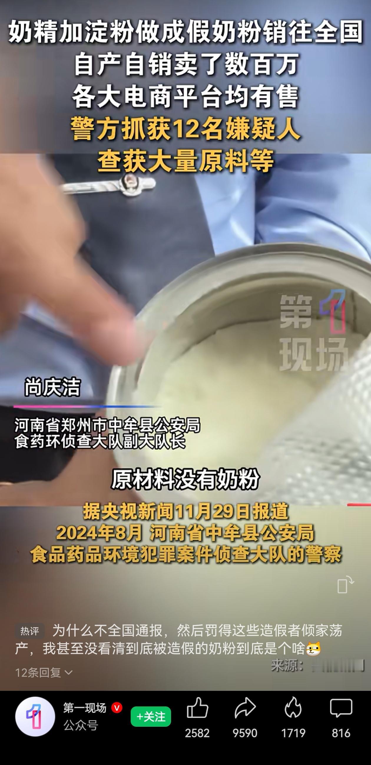 良心不痛吗?《央视新闻》11月29日报道了一起黑奶粉案件。河南中牟县警方去年八月端掉了一个制假窝点,这些黑心贩子实在缺德,用奶精和淀粉制造奶粉,再胡乱掺点工业香精弄出点奶香味,用漂亮的罐装外衣包装,高档进口奶粉就出厂了! 这些毫无营养的“奶粉”,居然伪造了十几种“进口奶粉”的包装,在好几个电商平台上打着“海外直销”、“低价清仓”的旗号销往全国,短短几个月涉案金额就超过了600万。 这帮人专挑自己人坑啊!连婴儿都不放过,各种重金属超标!年轻的父母们,还以为买到了好东西给自己的宝宝喝,哪知道却中了黑商贩的毒! 好在天网恢恢,三名主犯已经被重判了15年,真是大快人心! 强烈建议判决书注明,不允许享受减刑,必须实刑!这种伤天害理、专坑自己人甚至对婴儿下手的恶魔,判15年都难解心头之恨!他们赚的每一分钱,都是建立在无数家庭和孩子健康之上的。 谁再敢把黑手伸向我们的孩子,法律就敢让他们把牢底坐穿! 这不仅是给受害家庭一个交代,更是向所有黑心商贩发出的最严厉警告:伤天害理的钱,一分都不能赚! 多希望这个案子能成为一个终点啊!让所有父母买到的都是安心奶粉,给自己的孩子冲上的都是放心奶粉! 信息来源:第一现场