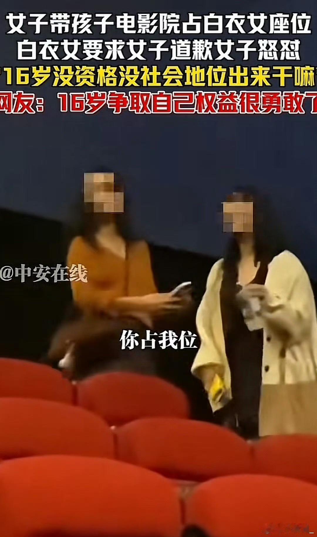女子带孩子电影院占座被怒怼,16岁女孩做得好!青少年就是应该在自己能力范围内为维护社会秩序作出贡献!现在社会中素质低下的人越来越多了,甚至觉得自己占座还有理了?请遵循道德底线,做一个遵纪守法,有诚信有道德的公民! 最近安徽蚌埠一家电影院里上演的闹剧,看得人直冒火。一位母亲带着孩子看电影,明明买了前排票,却嫌视线不好,直接占了后排一位16岁女孩的座位。女孩拿着票礼貌要求让座,这位母亲不但不让,还扯着嗓子吼:“16岁没资格没社会地位出来干嘛!”那嚣张的语气,仿佛整个电影院都是她家的。监控视频里,女孩被骂得眼眶发红,却依然挺直腰板反驳:“我买了票凭什么不能坐?”周围观众看不下去,有人小声劝“算了算了”,女孩的表哥站出来鼓掌支持,没想到占座母亲也跟着鼓掌,那副“我就占座你能拿我怎样”的无赖样,让全场观众气得直跺脚。最后影院不得不给300多名观众退票,这场闹剧才以警方到场收场。 这事儿真让人气不打一处来。16岁怎么了?16岁就该被随意践踏权益?这位母亲自己带着孩子看电影,本该给孩子树立遵守规则的榜样,结果却用“没资格”这种话贬低一个努力维护自身权利的年轻人。她可能觉得孩子在场就能道德绑架别人,可她忘了——真正的父母,该教孩子的是“己所不欲勿施于人”,而不是“我弱我有理,我闹我有理”。这种“巨婴式撒泼”不是第一次了,高铁霸座、迪士尼插队、现在连电影院都成了“法外之地”。这些人把公共空间当自家客厅,把其他守规矩的人当软柿子捏,可最后呢?300多人被迫退票,影院损失8万,自己也被全网骂上热搜——这波操作,真是“伤敌八百,自损一千”。 (来源:新浪微博)