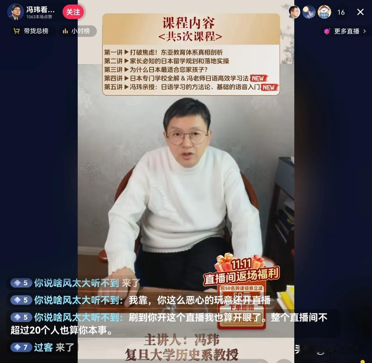 复旦大学的冯玮又开启直播了! 而且这次是顶风作案, 他居然在直播间里推广去日本留学。 就这节骨眼上还推广去日本留学,真是太坏了。国家都发通知了,让大家最近不要去日本旅游了,而这人还在这里推广去日本留学。 不过看到直播间里面的人都在骂他,我就放心了。