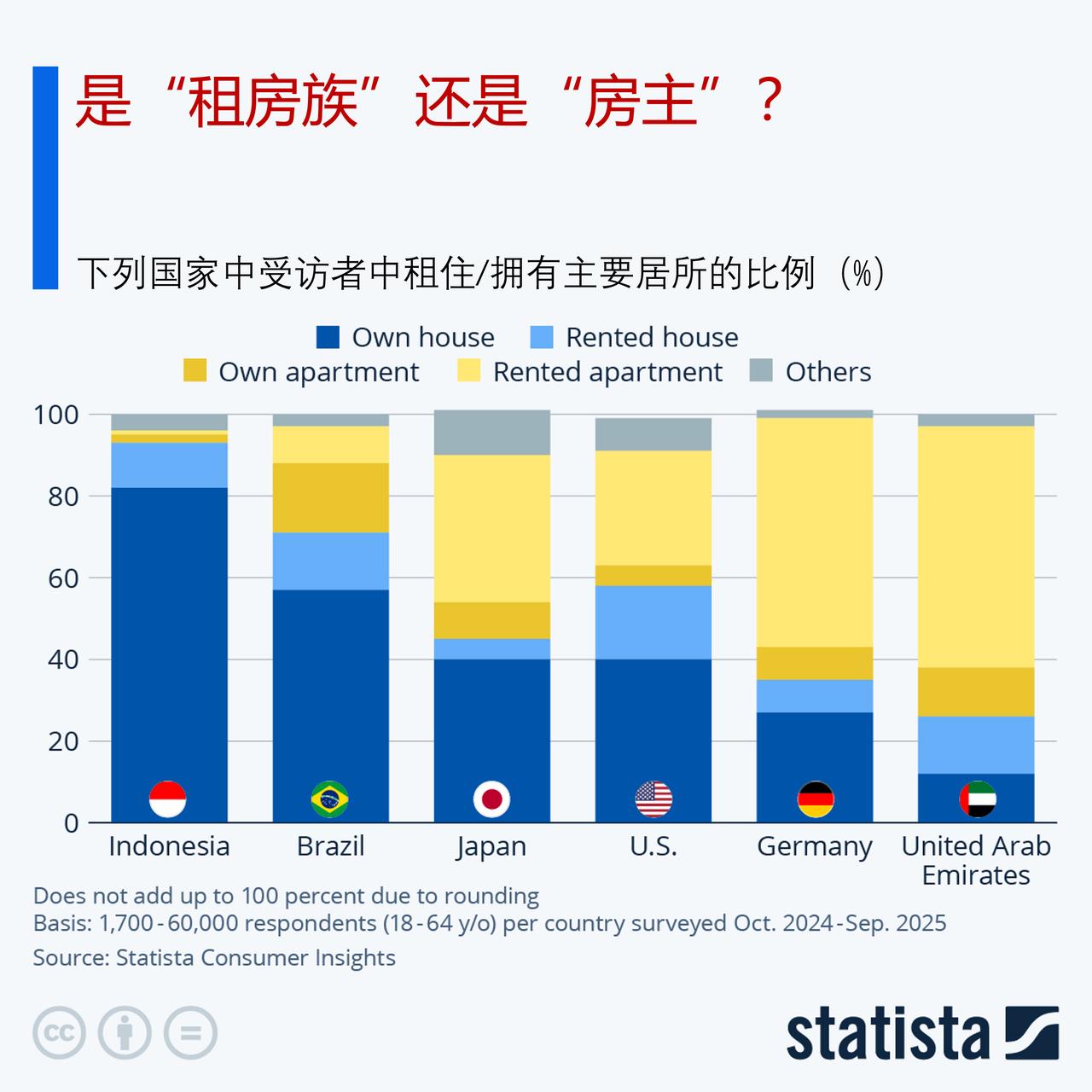 哪些国家有更多的“租房族”或“房主”?来看看不同国家的情况 从 Statista 消费者洞察调查的数据来看,不同国家的租房者和业主数量差异很大。在一些国家,比如印度尼西亚,超过 80%的人拥有自己的主要住所;而在一些国家,如阿联酋,这一比例低至 24%,在德国和瑞士则约为 35%。 众多因素影响着房地产市场,包括哪些人能够承担得起购房或租房的费用,以及谁会做出购房或租房的决定。有趣的是,较贫穷的国家通常会有更多的房主,因为在这些地方(尤其是农村地区),购买、建造或翻新一套普通的住宅,或者购买一块土地,可能与较低的成本相关联,尤其是在建筑规范不严格且税收较低的情况下。此外,在发展中国家,房地产可以作为一种更重要的投资或退休计划,因为金融产品或政府计划的供应可能不足。 除了印度尼西亚之外,在马来西亚、巴西、印度、菲律宾、墨西哥和越南,房屋拥有率也达到了或超过了 70%的水平,而在波兰、意大利和新加坡也有类似情况。在这后三个国家中,更多的人选择拥有公寓而非独栋住宅,而在韩国(总拥有率为 62%)、西班牙(66%)和芬兰(49%)也是如此。 在富裕国家,房屋的建造、翻新和购置往往伴随着高昂的材料费、人工费和税费。这些国家通常也依赖抵押贷款来促进住房所有权的实现。德国是经合组织成员国中住房拥有率最低的国家之一,其部分低拥有率现象可归因于过高的税收和抵押贷款利率。与其他国家不同,德国不对自住业主提供利率优惠,因此错失了促进住房所有权发展并使其更易获取的另一个机会。在此次调查中,住房拥有率较低的其他地区包括沙特阿拉伯(42%)和瑞典(43%)。在美国,45%的人拥有自己的住房,略低于日本、荷兰或加拿大的比例。 无论是在经济较落后的国家,还是在经济较为发达的国家,个人或家庭承担部分房屋建造或翻新的工作都能大幅降低成本。同样,在那些将拥有住房视为理想目标的国家,人们也会更多地追求购房这一目标。
