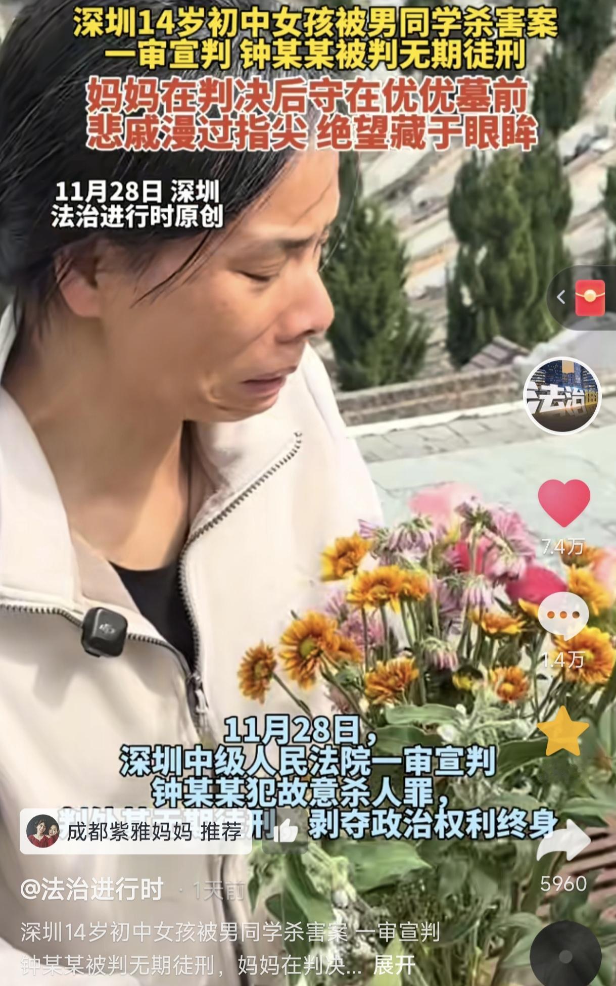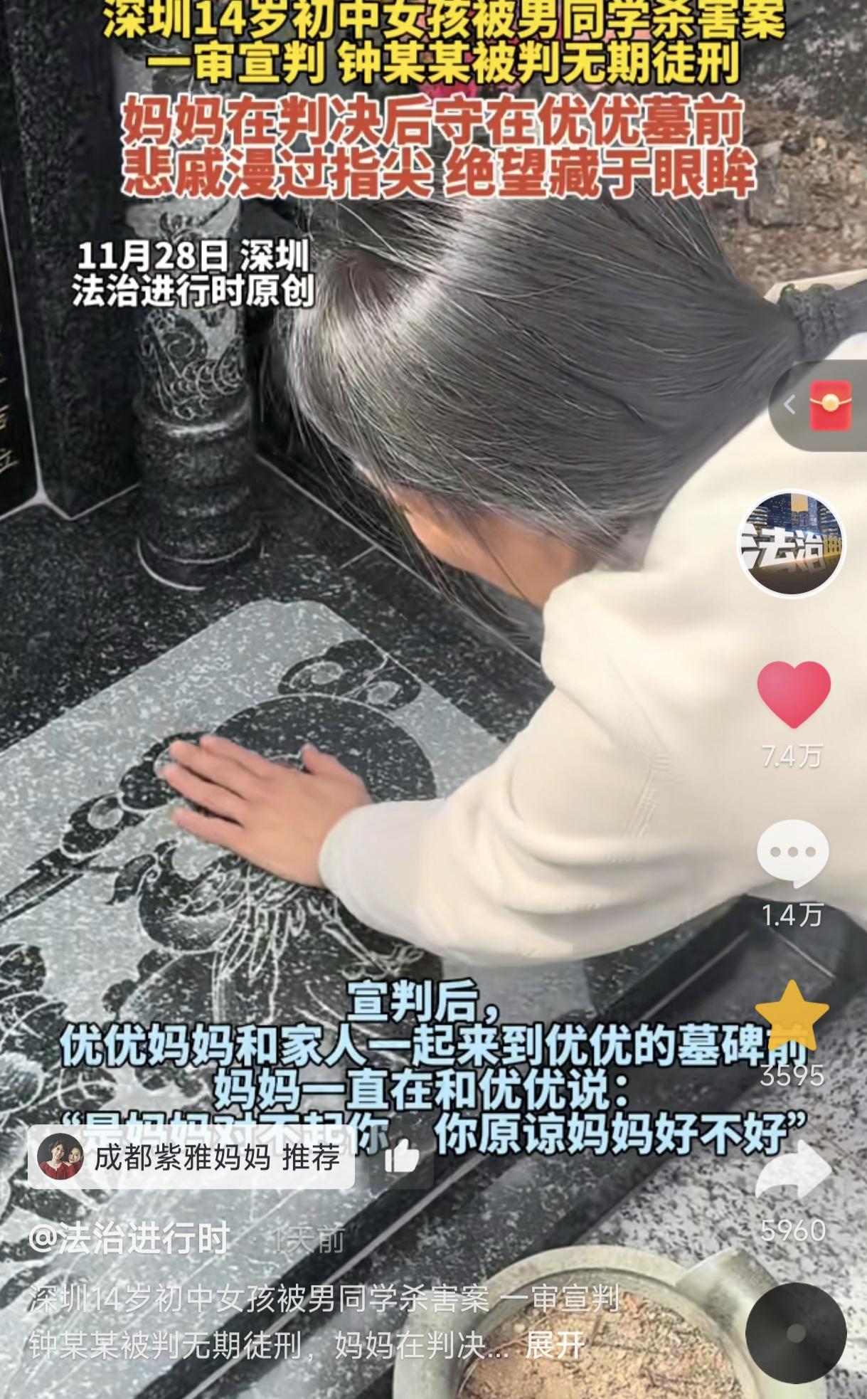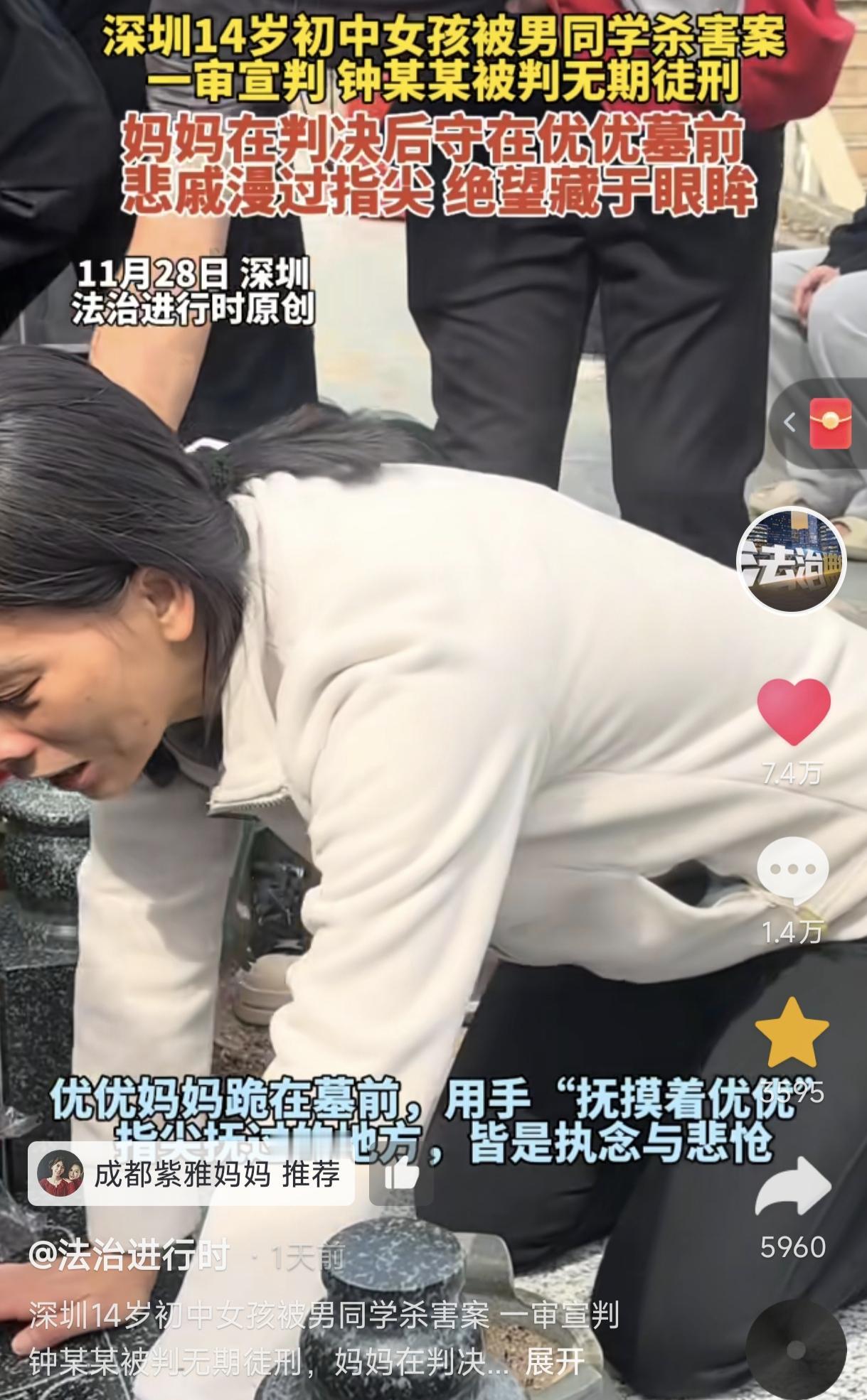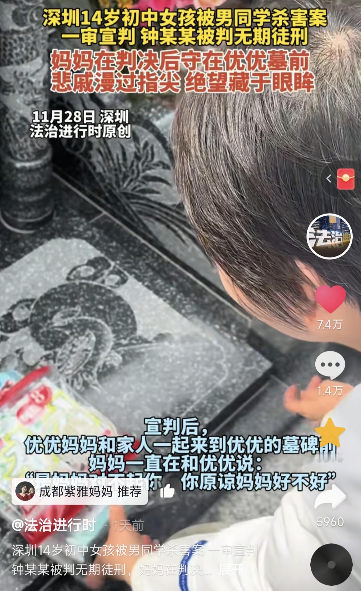 宣判后优优妈看望女儿的这一幕,让人泪奔:妈妈带着优优爱吃的海苔、蛋糕来看她,一遍遍地抚摸着女儿冰冷的墓碑,悲恸万分,还一遍遍自责地对女儿说:“爸爸妈妈对不起你,没有早点搬家,你原谅妈妈好不好......“ 可是,善良的优优妈妈哪里知道年仅14岁的钟建川会是一个28秒内连捅女儿26刀的丧心病狂的“恶邻”呢,否则也不会连续三年免费接送对方上下学。 有的人善于伪装,尤其沉默寡言的人,你根本无法从他每天云淡风轻的脸上看出丝毫的恶意来。 虽然说“君子不立危墙之下”,但人首先得要预知到可见的危险才会主动规避。只能说,凶手钟建川心机太过深沉了,成功骗过了所有热心善良的大人以及单纯阳光的优优。 最终悲剧发生,优优永远离开了这个世界尤其疼爱她的爸爸妈妈。优优妈一夜白头,仅仅半年时间就形销骨立,憔悴不堪,老了至少10多岁,她永远都无法走出丧女之痛。 钟建川被判无期徒刑,优优妈哭到崩溃:“无期徒刑不是终身监禁,我要抗诉!”因为无期徒刑还可能出来,凶手人生还能重启,只有终身监禁才永远出不来。同样都是14岁少年,一死一生,一个长眠地下一个还有未来,这是多少人的意难平! 优优妈去看望女儿时,悲伤到难以自抑,自责得无以复加,悲痛的是女儿惨死却无法让凶手为女儿偿命甚至连终身监禁都很难,自责的是没有提前搬家远离恶邻。 没有哪一个妈妈可以不流泪的走出报道优优案的视频,看着悲痛到几乎晕厥的优优妈妈,看着她一脸凹陷,看着她满头银丝在风中摇曳,真的会让人哭到泪奔。法制进行时用这12字精准表达出优优妈此刻的悲痛情绪:“悲戚漫过指尖,绝望藏于眼眸”。 这给我们提了一个醒:看看身边有没有沉默寡言、面相凶狠的“恶邻”,如果有,请尽早远离。 要记住:真正的邻里底线是“互不打扰,彼此尊重”,虽然看起来不那么和谐,却是自保之法。 真心希望恶魔能被严惩至少被终身监禁,不要再出来害人,更希望这样的悲剧永远不再重演! (来源:法治进行时) 深圳优优遇害案