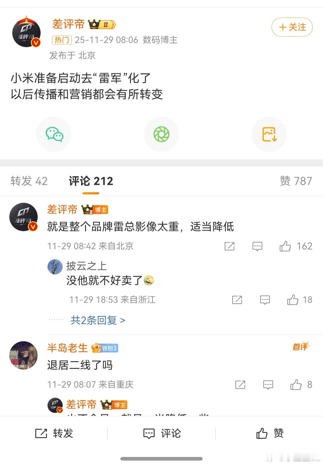 有大V说小米准备启动去雷军化了,以后传播和营销都会有所改变。你们怎么看?
