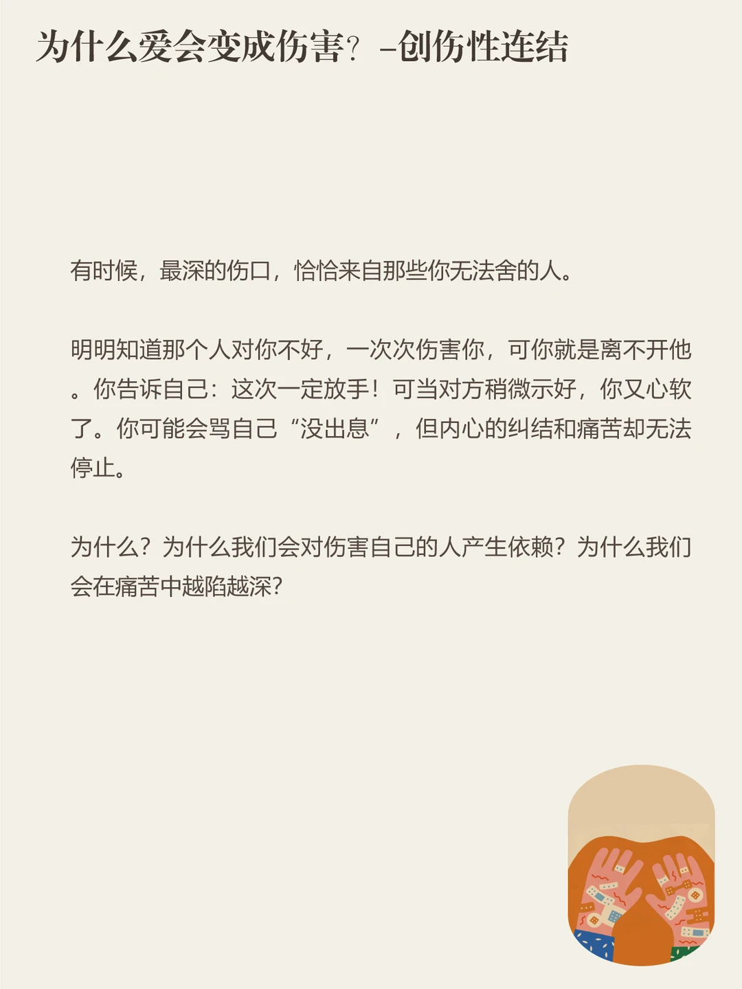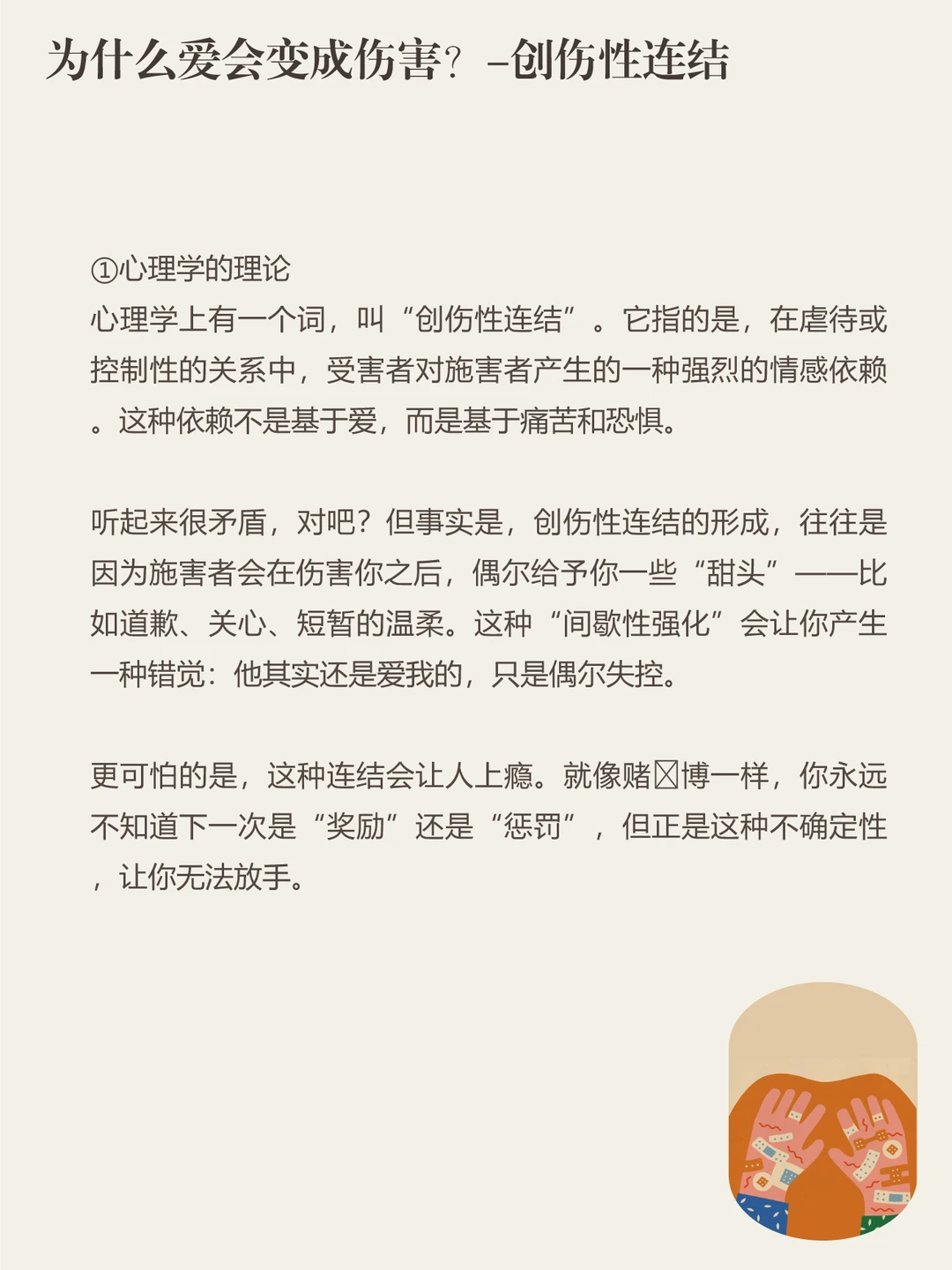📚心理学上有一个词,叫“创伤性连结”。它指的是,在虐待或控制性的关系中,受害者对施害者产生的一种强烈的情感依赖。这种依赖不是基于爱,而是基于痛苦和恐惧。