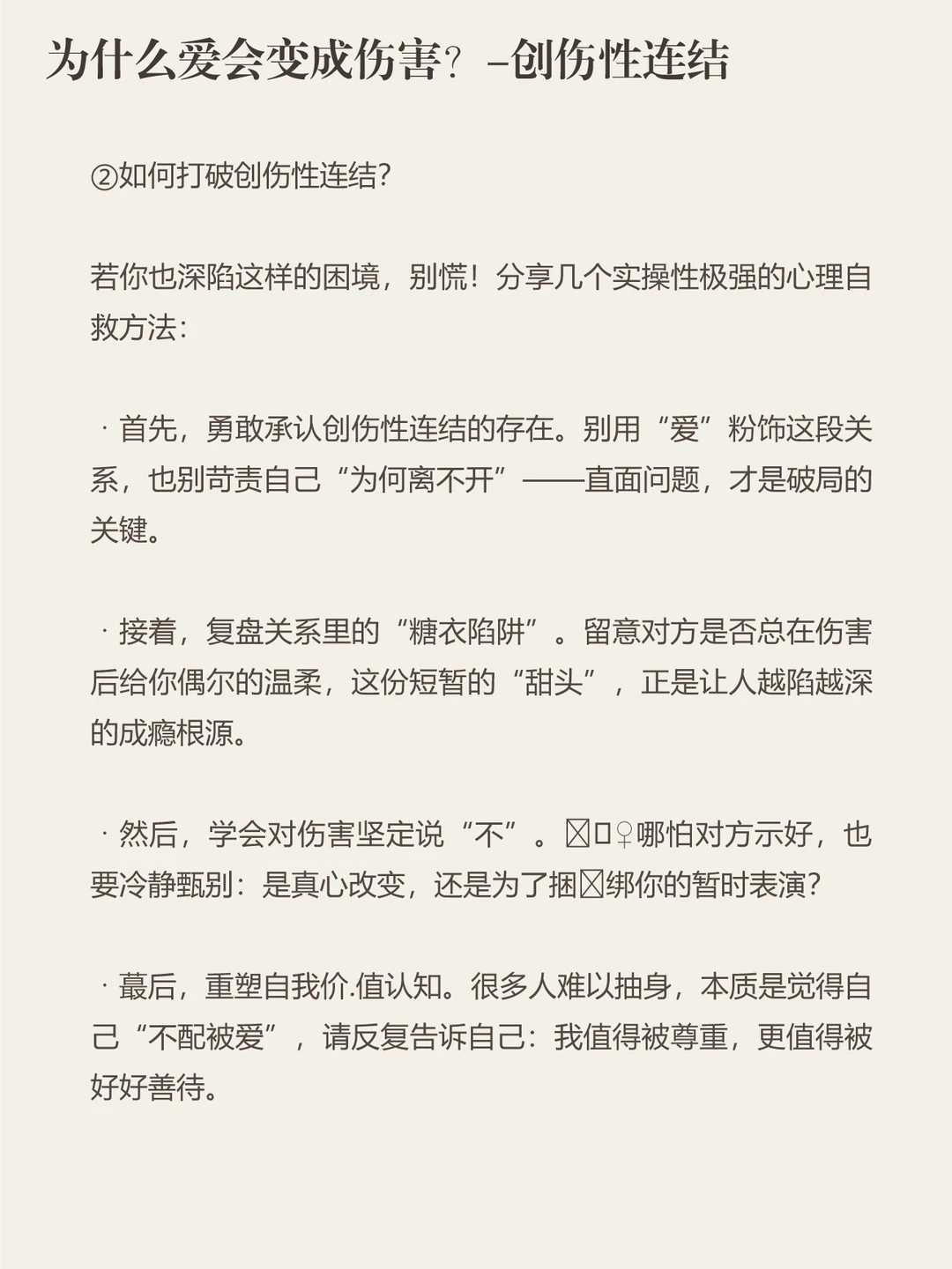 🔸首先,勇敢承认创伤性连结的存在。别用“爱”粉饰这段关系,也别苛责自己“为何离不开”——直面问题,才是破局的关键。