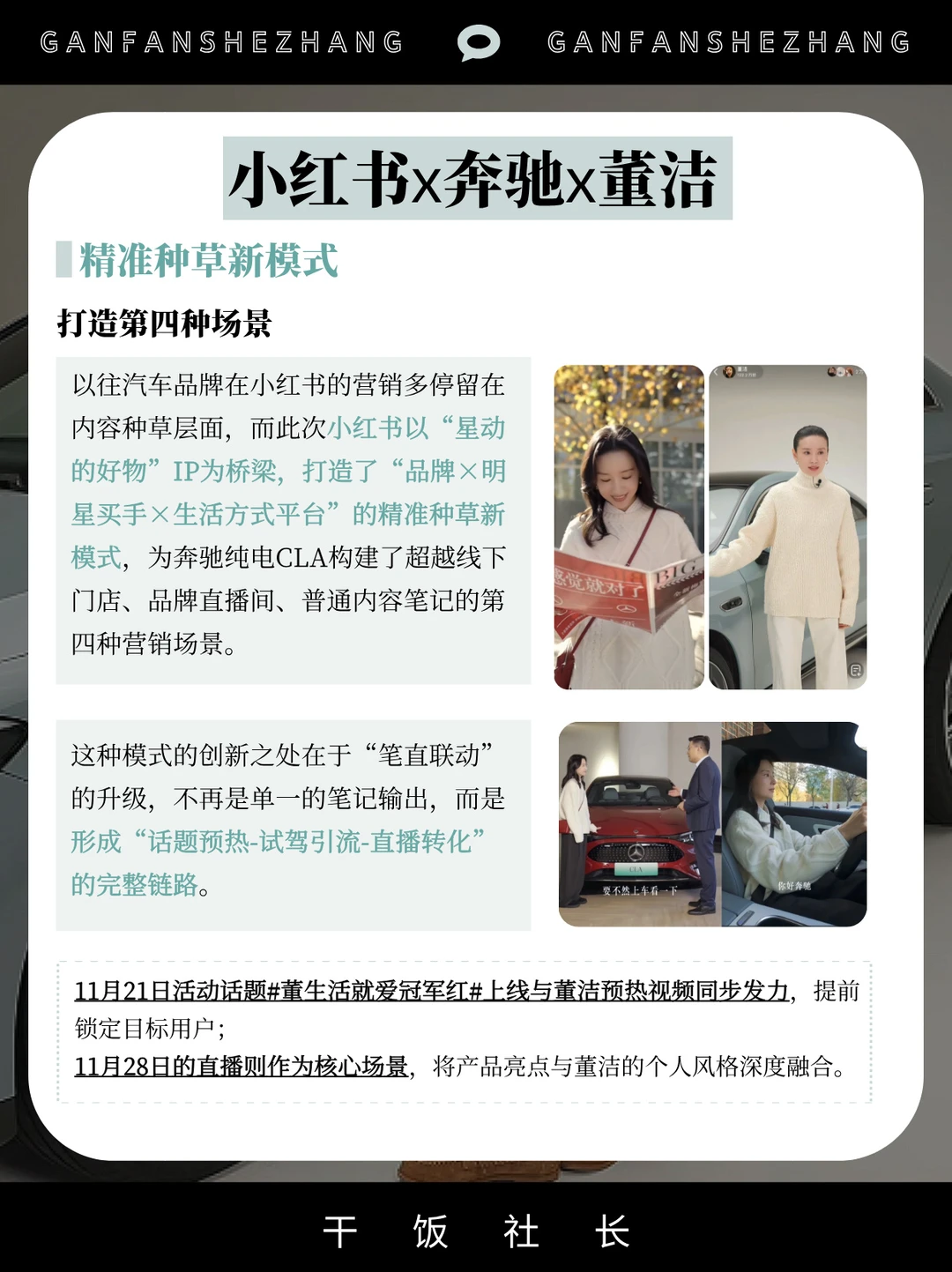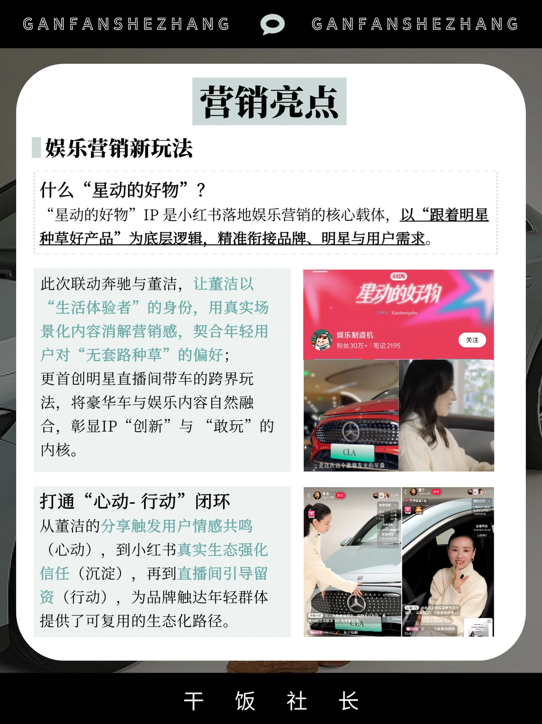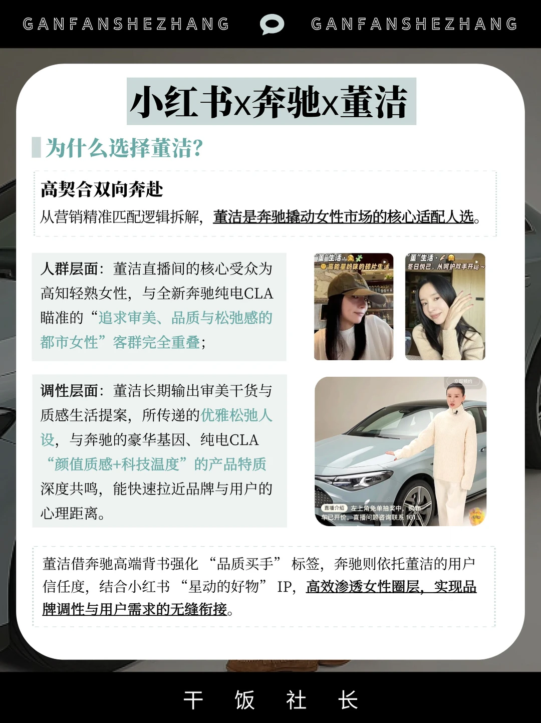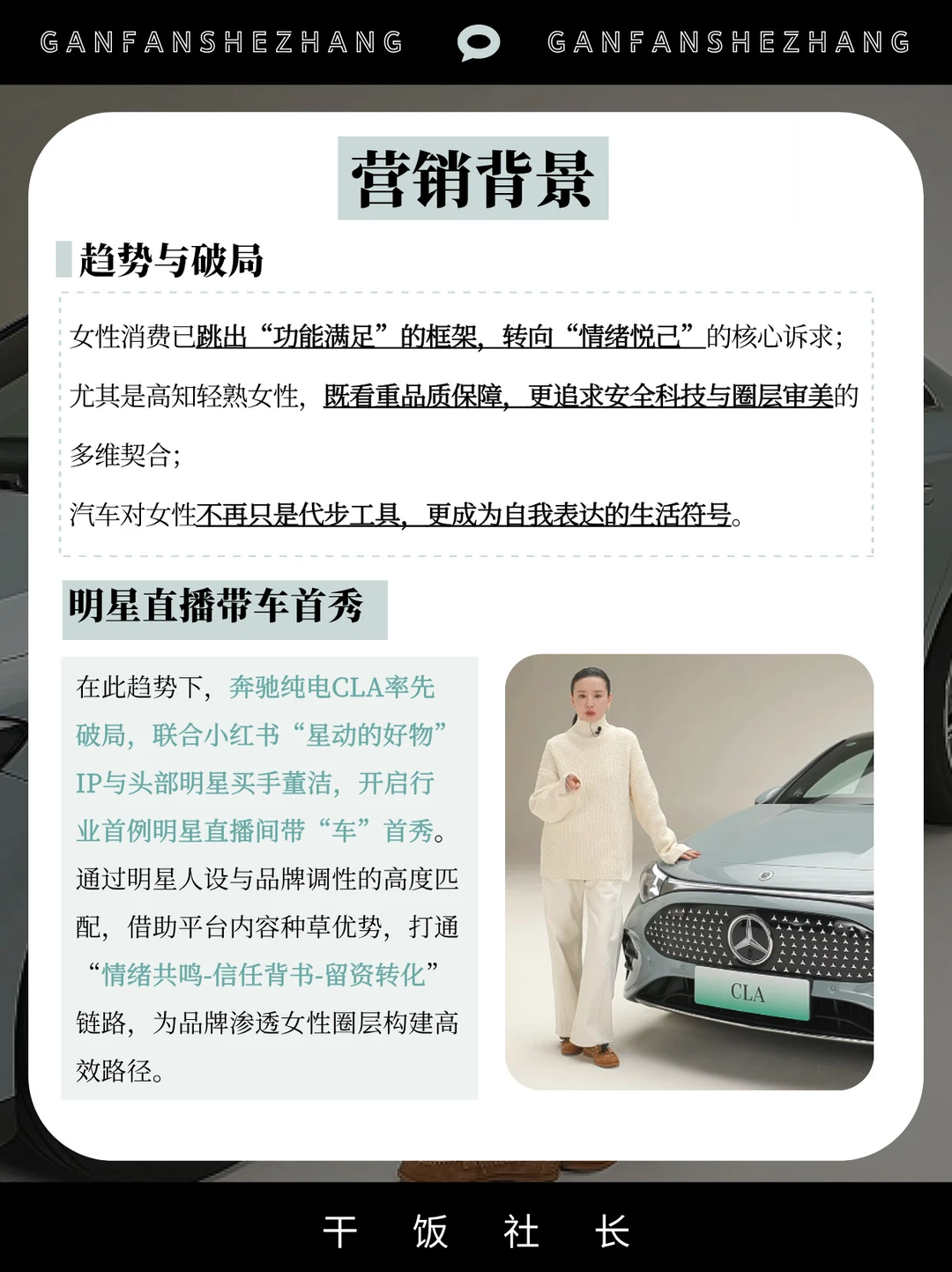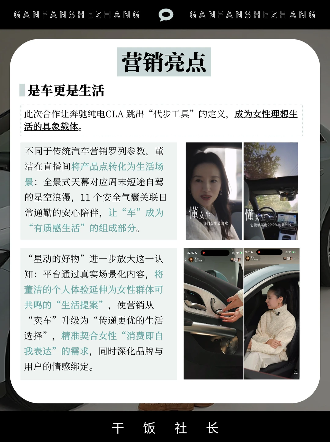 当下女性消费早已从“功能满足”升级为“情绪悦己”,高知、轻熟女性群体更在消费中追求审美契合、品质保障与松弛感的双重满足👏 这一趋势延伸至用车场景,女性对汽车的需求不再局限于代步工具,更成为自我表达、生活方式的延伸,既要颜值与质感并存,又要兼顾安全、舒适与科技温度,还要契合自身圈层的审美认同🎯 洞察到这一核心需求,全新奔驰纯电CLA 携手、头部明星买手董洁,开启行业首例明星直播间带“车”首秀,精准锚定女性市场发力💪 董洁的直播间向来以轻熟、高知女性为核心受众,持续输出审美干货、品质生活提案与自我和解的情绪价值,其人设与奔驰的豪华调性、纯电CLA的产品特质高度契合💓 而作为本次合作的核心纽带,以“星动的好物”IP为桥梁,不仅打破了豪华汽车品牌传统营销的刻板印象,更通过内容种草、信任背书、留资转化的闭环,让奔驰纯电CLA快速渗透女性圈层,也为行业验证了“品牌×明星买手×生活方式平台”的创新合作模式🌟