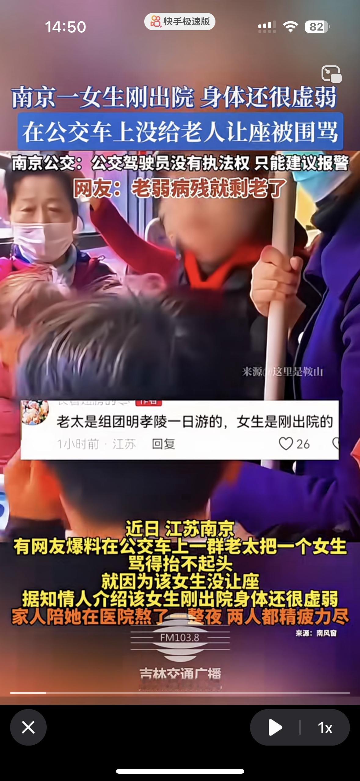 这下老弱病残只剩下老了!还是倚老卖老 这是不是养老金太高了没事找事?老人在公交车上谴责一位女生 因为她没有给老人让座被一群老太太围起来挨骂,可是这位女生才刚刚出院,而老太太们是一日游出去玩。 女生刚刚出院身体还很虚弱,而她的家人陪了她一整夜两个人都精疲力尽,却被老太太们认为她们不够尊老爱幼!大家说怎么老人越老越不讲理呢?