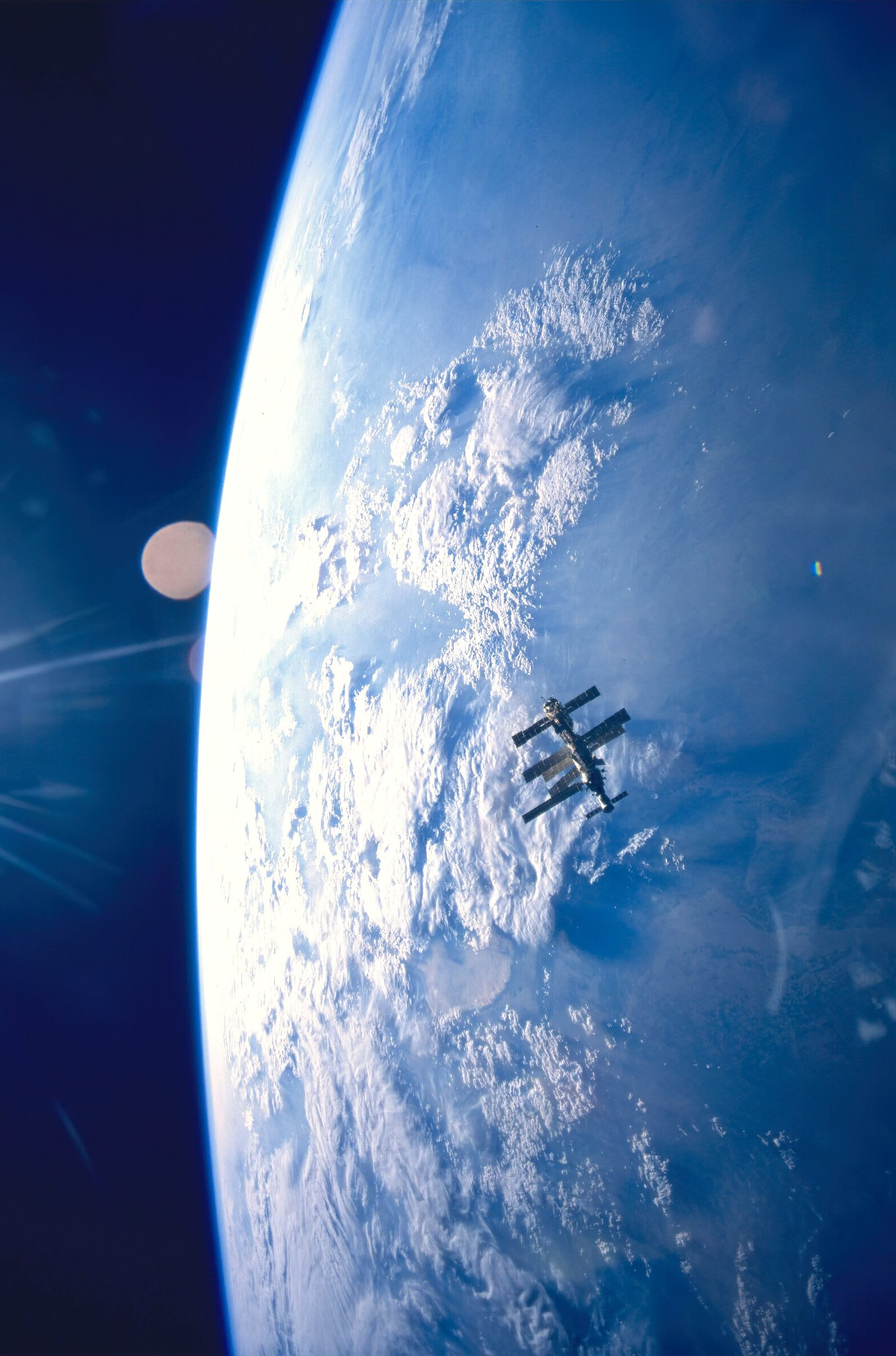 1995年。从发现号航天飞机上拍到的和平号太空站