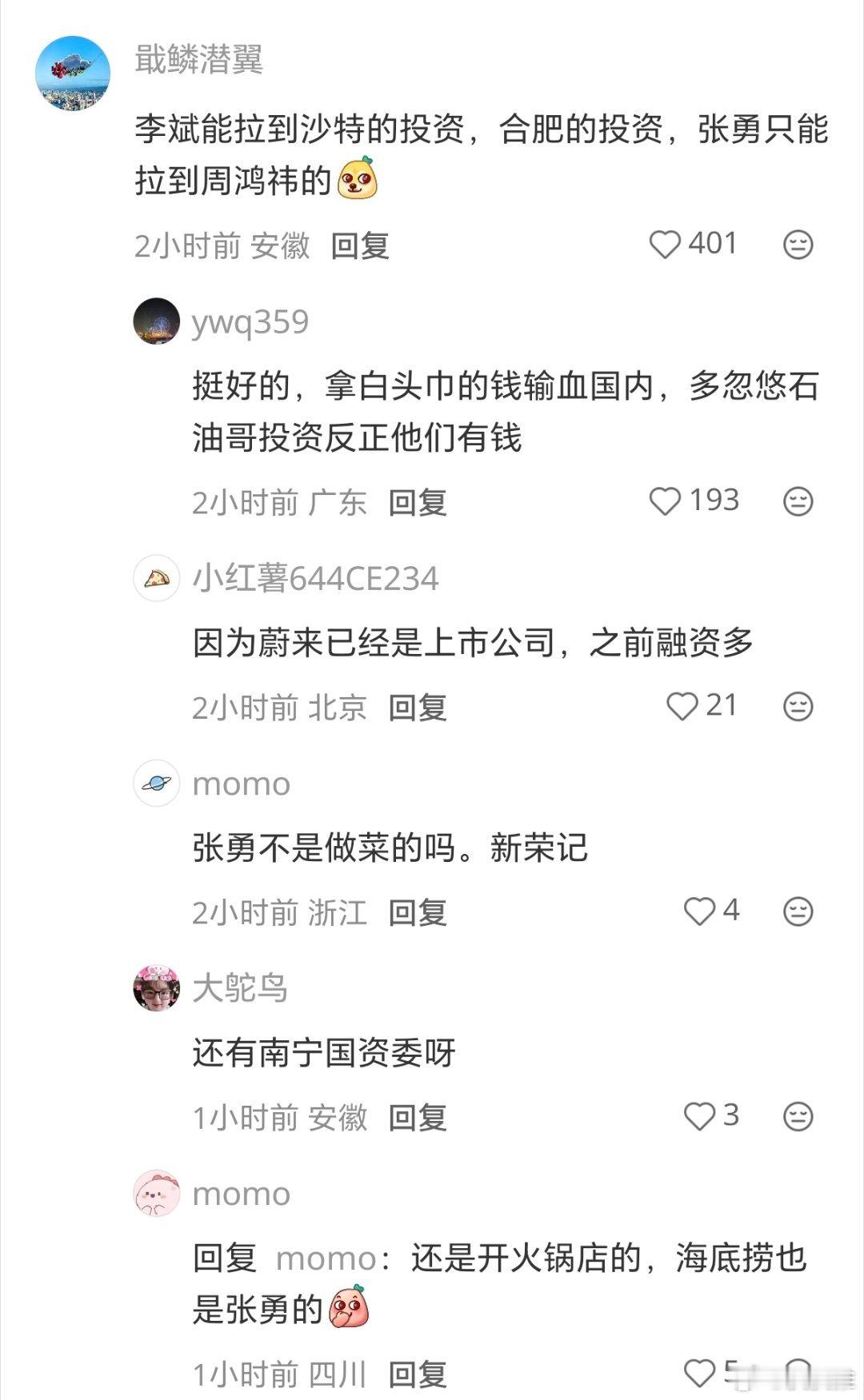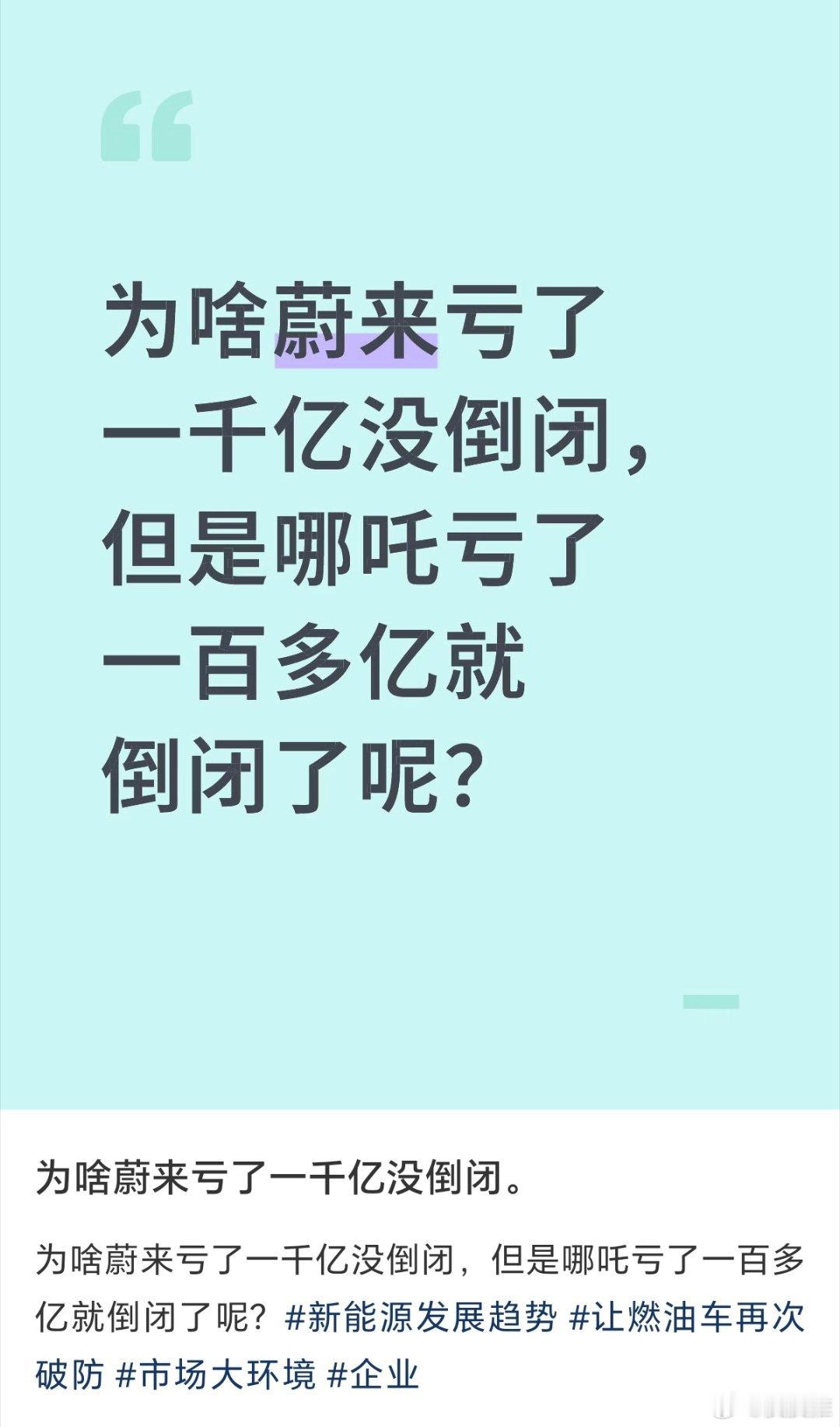 为什么哪吒亏了一百多亿就倒闭了,而蔚来亏损那么多都没倒闭?网友评论:李斌能拉到沙特的投资,合肥的投资,而张勇只能拉到周鸿祎的投资。科技先锋官