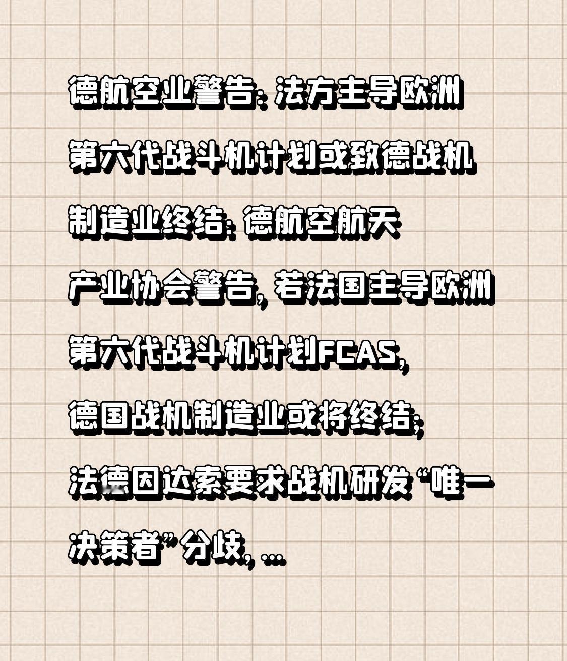 德航空业警告:法方主导欧洲第六代战斗机计划或致德战机制造业终结:德航空航天产业协会警告,若法国主导欧洲第六代战斗机计划FCAS,德国战机制造业或将终结;法德因达索要求战机研发“唯一决策者”分歧,项目停滞;德方反对称会受制法方,达索放话宁可单干,项目延误一年,德防长称年底前决定方向。