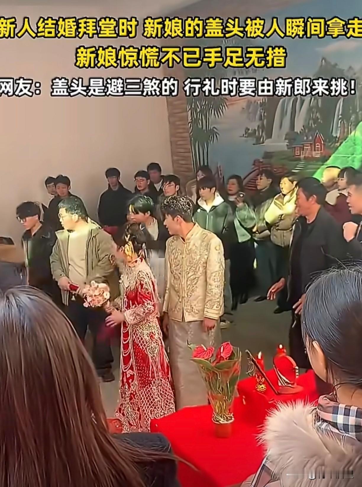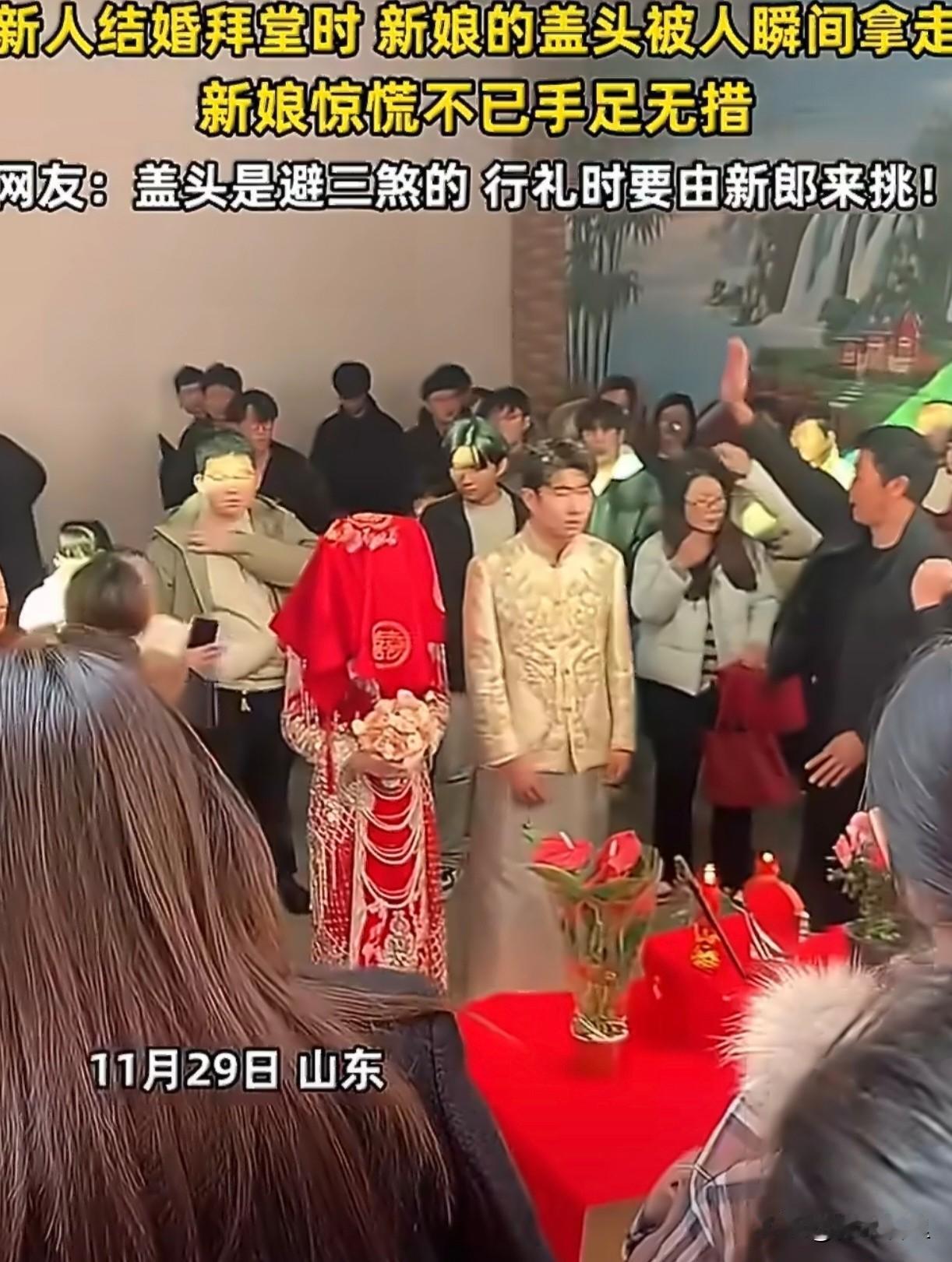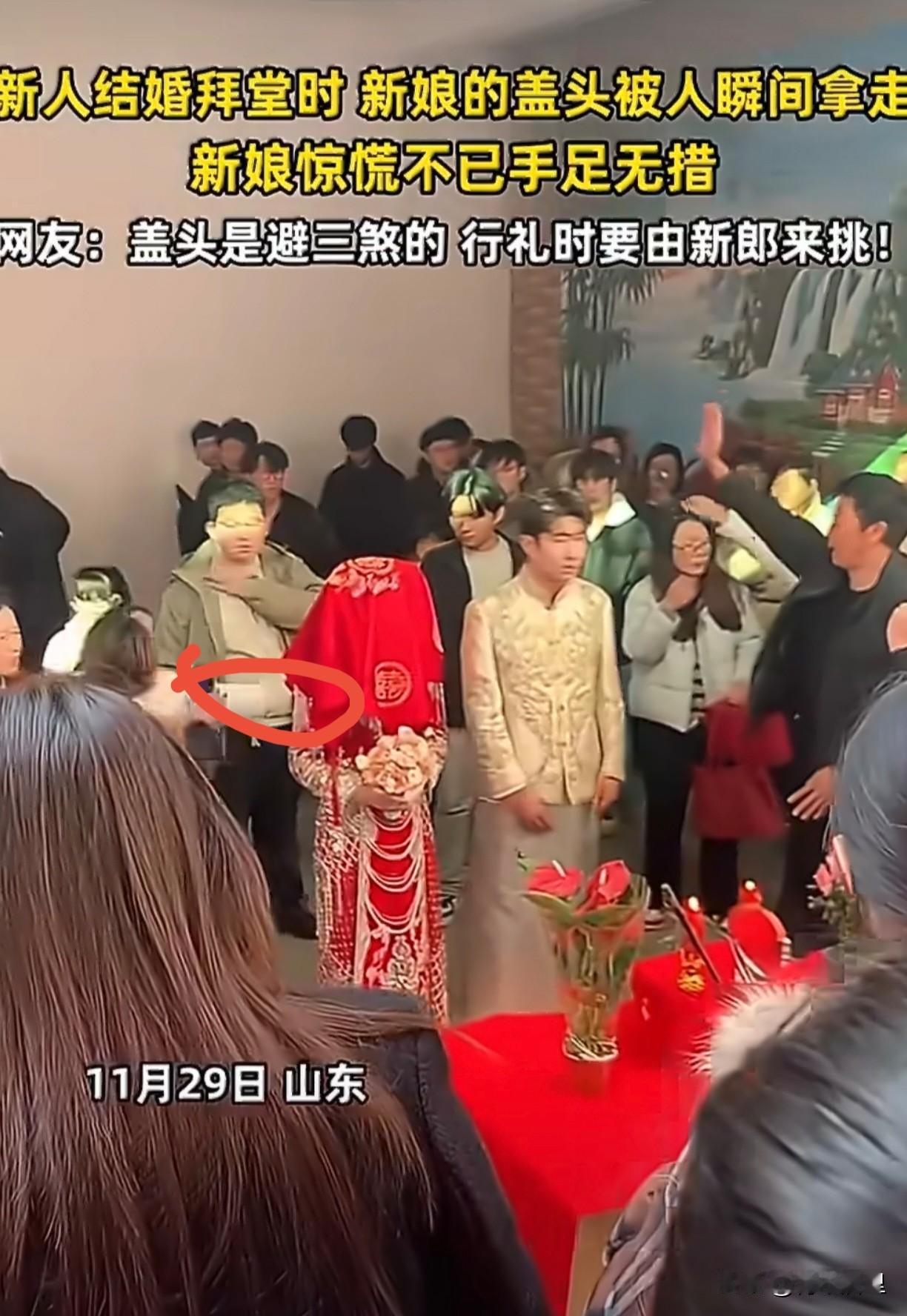 这么大的年龄,还这么没规矩,手还这么不老实[what]。 山东一对新人结婚,在拜堂的时候,旁边一大妈直接伸手把新娘头上的盖头扯掉就走,旁边的人硬拉着才把盖头抢过来给新娘重新盖上。 红盖头是有特殊寓意的,是要由新郎揭开的。这大妈这一下,直接给人家一天的好心情给扯没了。还是新人脾气好,遇到脾气差的,直接给她轰出去。