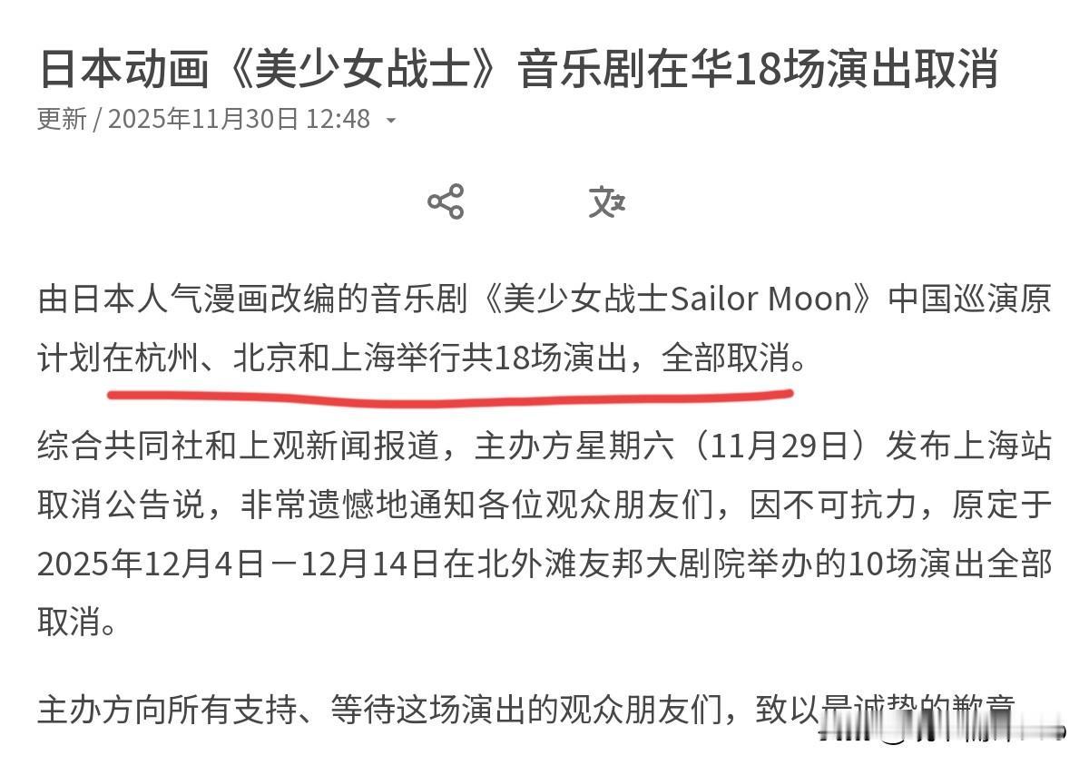 “限日令”来了!18场演出全部被取消,高市早苗绝对没有蒙混过关这一选项!11月30日,根据外媒报道,外媒称,由日本人气漫画改编的音乐剧《美少女战士Sailor Moon》中国巡演原计划在杭州、北京和上海举行共18场演出,全部取消。外媒称,不仅如此,日本首相涉台言论导致中日两国关系紧张后,滨崎步、和田薰等多名日本艺人在华活动被取消或延期。 《蜡笔小新》等两部日本电影也暂缓上映。很显然,现在我们国内日本电影,音乐剧,艺人演唱活动被取消,这说明什么呢?这说明我们对于日本正式启动“限日令”来反制日本政府了。而上一次,我们对国外文化产业进行反制,就是韩国不顾我们的警告,蓄意部署萨德导弹系统。某种程度来说,这一次我们反制日本的动作,已经超过当年的“限韩令”。 当然,在我们启动这一反制动作之后,日本国内,包括我们国内都有一些看法,有些人支持,有些人不理解,有些人甚至批评。但是,如果从反制力度来看,我们的反制手段可以说已经非常的克制了。无疑,我们这是在给高市早苗机会,希望其及时刹车,以免对中日关系造成既深且巨之冲击。 日前,我们的解放军连续进行多日军演,发生震慑性信息,我们的海警船连续出现在钓鱼岛海域,而经贸层面的反制,“限日令”更像是开胃前菜,我们明显还有杀招没动。很显然,我们正在逐步提高反制的烈度,高市早苗没有蒙混过关这一选项,中国的警告也绝非停留在口头上。何去何从,高市早苗自己掂量清楚。