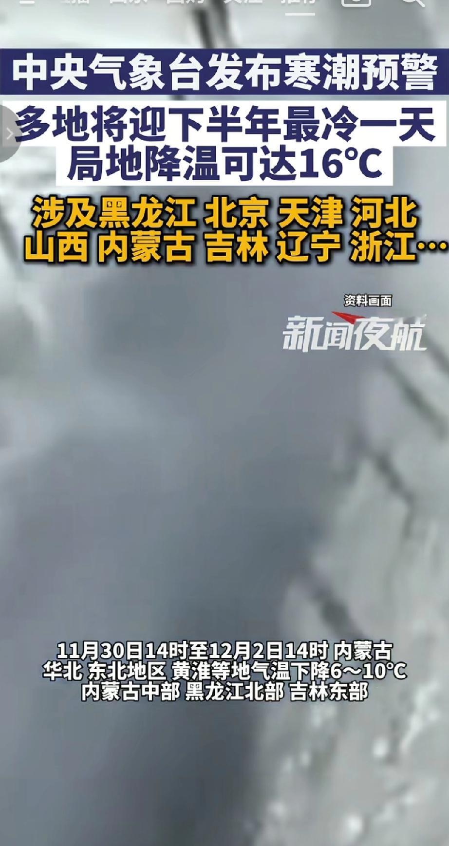 中央气象台发布寒潮预警,多地将迎来下半年最冷一天,局地降温可达16℃。受寒潮影响,预计11月30日至12月3日,我国中东部地区自北向南出现大风降温天气。括黑龙江、北京、天津、河北、山西、内蒙古、吉林、辽宁、浙江等多个省市自治区。