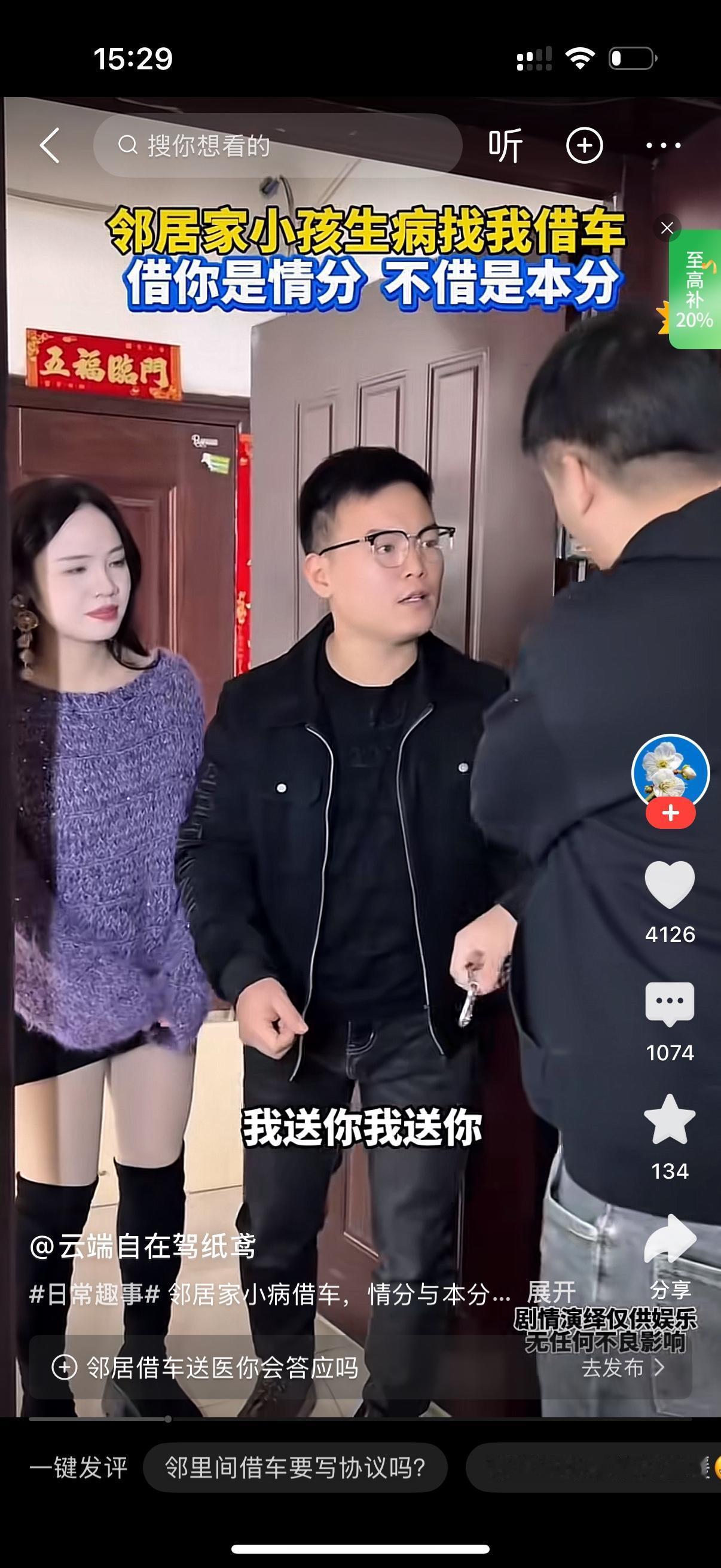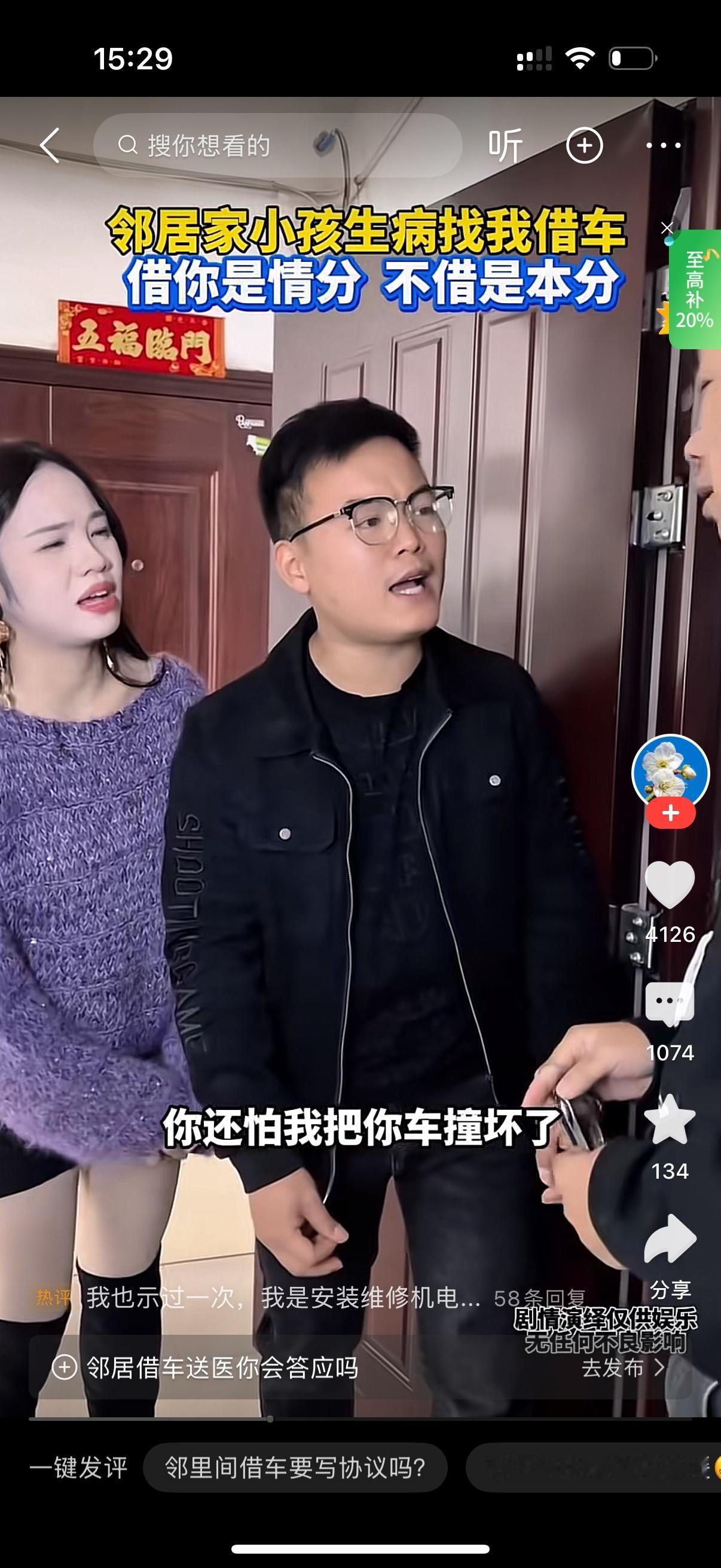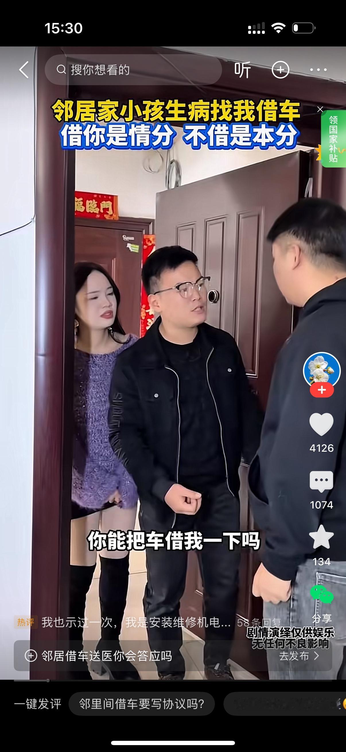 邻居家小孩生病找男子借车。男子的车是新车,怕邻居把车撞坏引起麻烦,就说要送他们过去。邻居夫妇却执意要自己开车过去。男子不同意,说自己的车是新车,你们撞坏了,到时麻烦。邻居却说,我技术杠杠的,不会有事。就算撞坏了,赔你就是了,又不是什么豪车,不怕赔不起。男子还是不放心,坚持要自己送。邻居却发飙了,你什么破车,磨磨唧唧的,找你借是给你面子。男子没想到邻居这样说话,所以也不客气地说,我借你是情分,不借你是本分。现在爷不借了,滚。说完,男子就把门关上了。邻居夫妇面面相觑,尴尬至极。