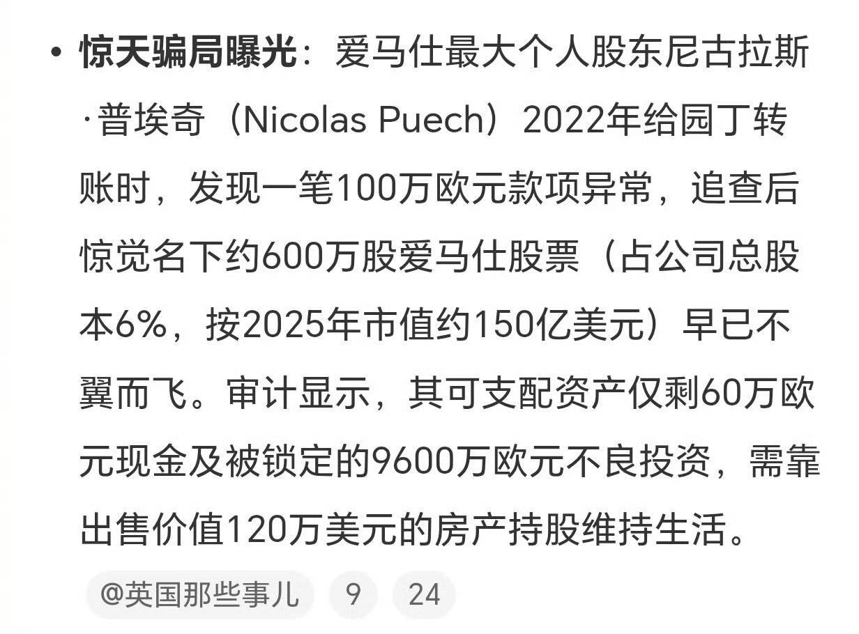 爱马仕大股东普埃奇150亿美元股份人间蒸发,东窗事发还是因为他要给自己的养子送100万欧元,发现迟迟不到帐,才去查看账户,原来自己的财富早就灰飞烟灭。而在此之前他一直过着富家公子的潇洒日子。把他的钱弄光的,是他最信任的理财顾问,通过把股票转成不记名的账户,一系列操作把股份变卖了,普埃奇却不知情。而今钱没了,理财经理弗雷德曼也在瑞士被火车撞死,死无对证。爱马仕nata 爱马仕