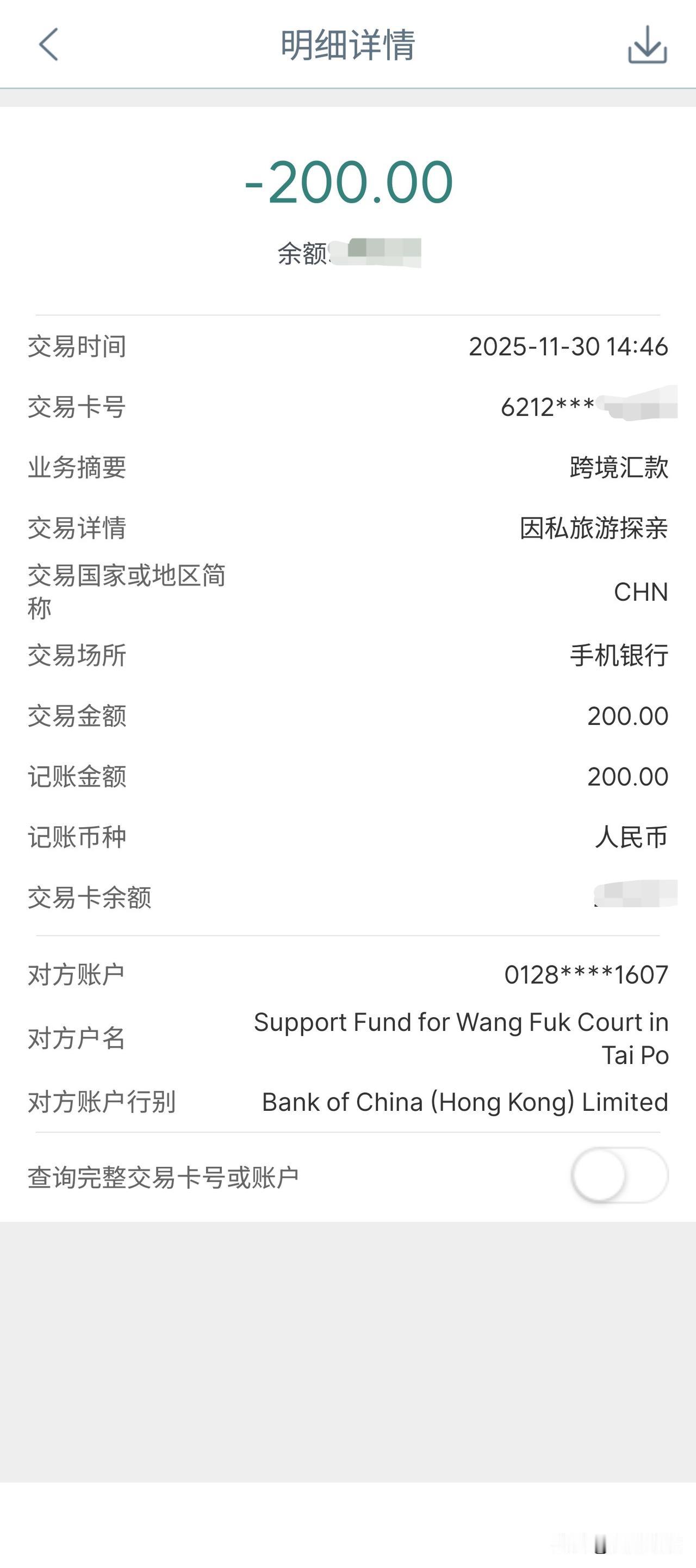 略尽绵薄之力!香港加油!虽然我们也不富裕,但还不至于揭不开锅,至少有地方住,有个温暖的家。 一场大火,让成百上千个家庭遭受严重损失。几十年的努力付之一炬,痛心不已! 冬天的岭南,干燥,海边城市,还有冷冷的风,火灾隐患巨大。这次就是在这干燥的冬季,造成悲剧。 希望以后不再有,大家都安好无恙! 香港加油!背后有强大的祖国和人民!